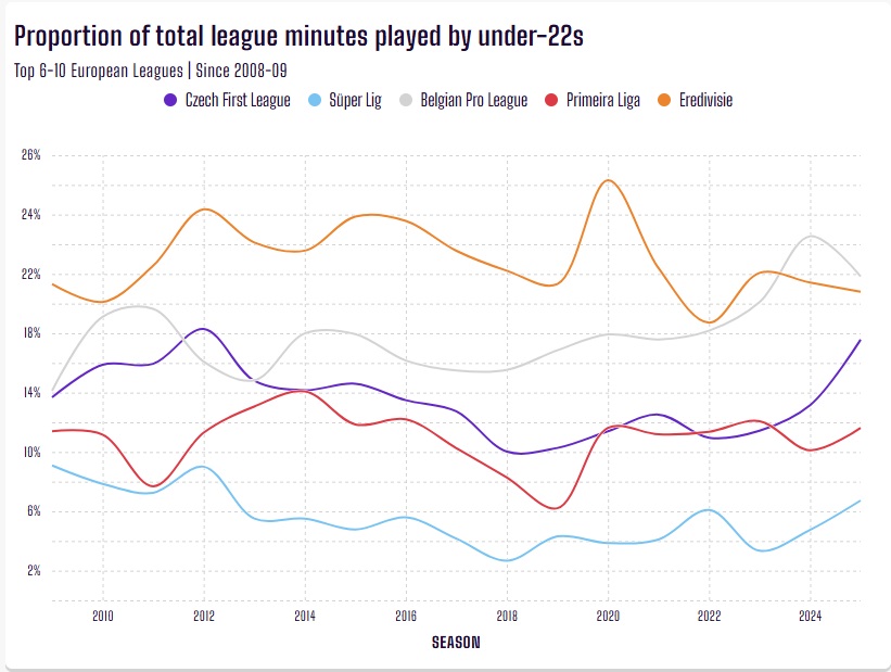 Бельгийская Про-лига демонстрирует впечатляющий рост доверия к молодым игрокам в последние восемь лет. Если в сезонах 2016/17 и 2017/18 на футболистов до 22 лет приходилось лишь 15,5% игрового времени, то к 2023/24 этот показатель вырос до рекордных 24,5%. Даже после небольшого снижения до 21,8% в прошлом сезоне бельгийский чемпионат сохранил лидерство среди топ-10 европейских лиг по доле молодёжи.