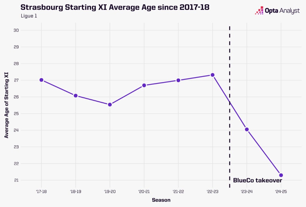 В сезоне 2024/25 «Страсбур» установил беспрецедентный рекорд — средний возраст его стартового состава составил всего 21 год и 106 дней. Это почти на целый год меньше предыдущего рекорда среди топ-10 европейских лиг, принадлежавшего «ПСВ» в сезоне 2013/14 (22 года и 84 дня).