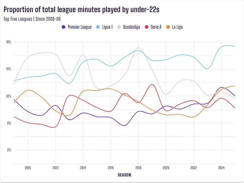 Бундеслига демонстрирует схожую тенденцию: за те же 17 лет доля игроков до 22 лет составила 13%. Хотя это немного меньше, чем во Франции, Германия также остается одной из самых благоприятных лиг для молодых футболистов.
