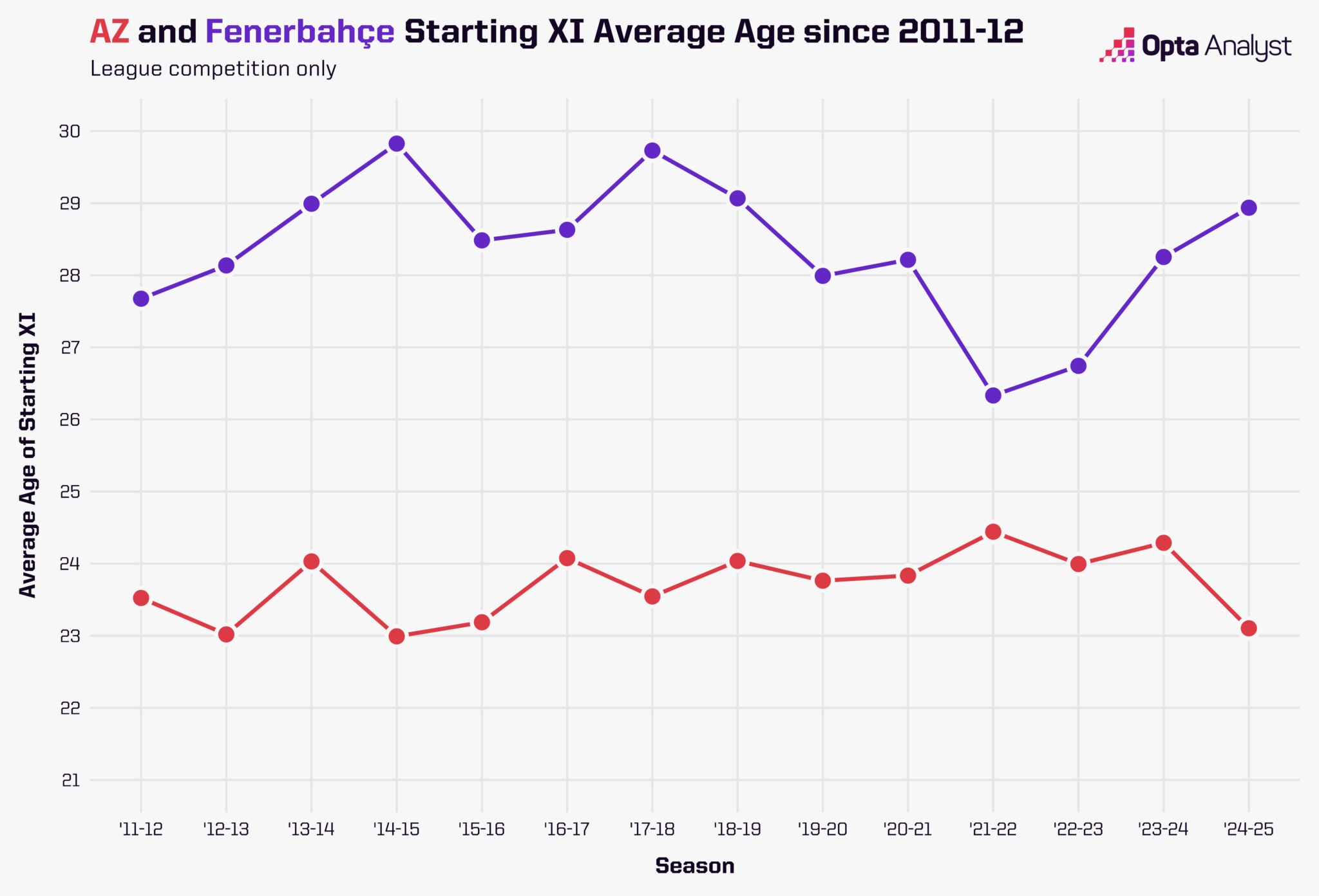 На другом конце спектра находится «Фенербахче» — среди всех клубов, непрерывно выступающих в топ-дивизионах с 2011 года, у него самый возрастной стартовый состав. В среднем за эти 14 лет игроки стартового состава стамбульского клуба выходили на поле в возрасте 28 лет и 128 дней.