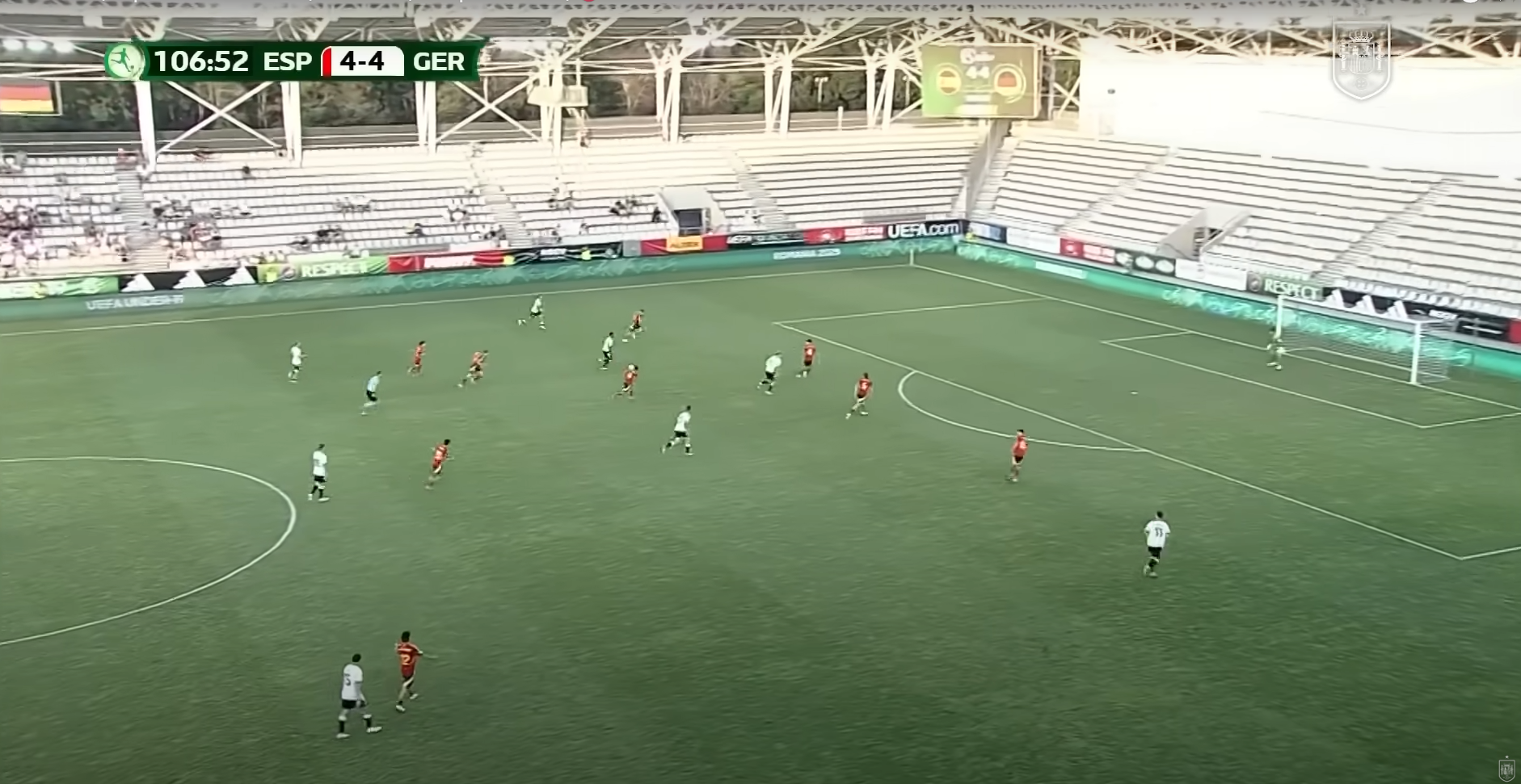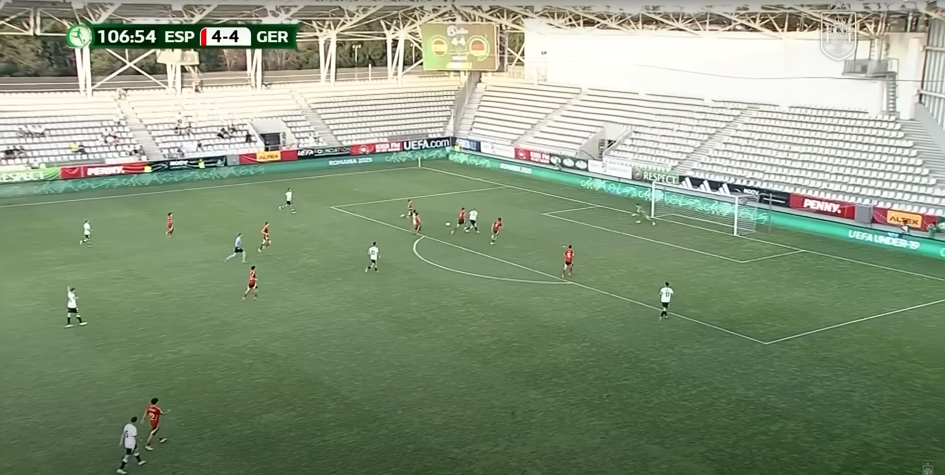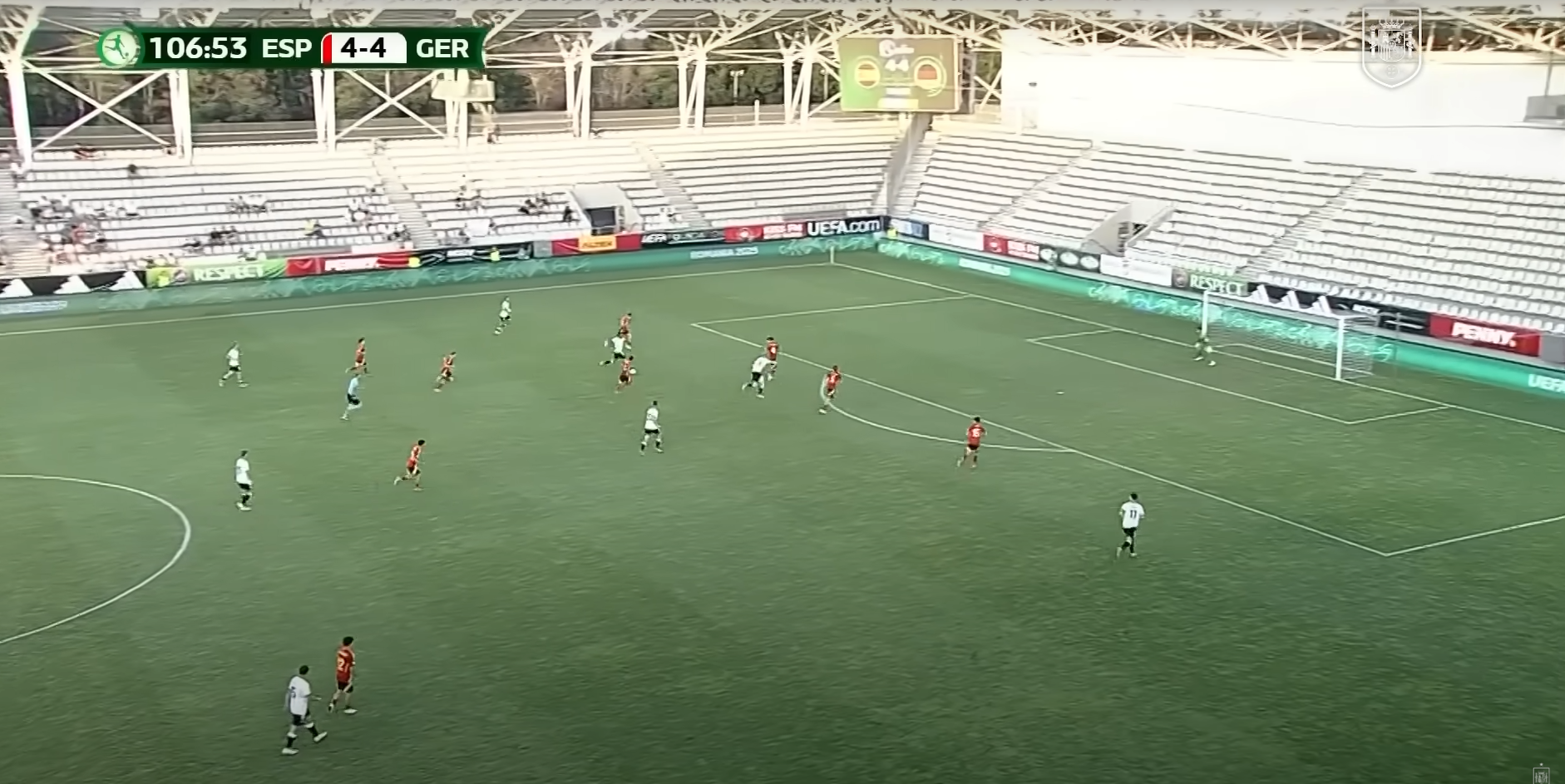Матч завершился победой сборной Испании в дополнительное время 6-5. Если посмотрите обзор матча целиком, то обнаружите, что все 3 мяча Мёрштедт забил из штрафной в одно касание.