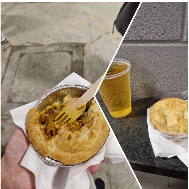 Пройдя на стадион сразу иду к киоску с едой и беру Chicken Balti Pie. Индийские специи, мясо, тесто – восторг.