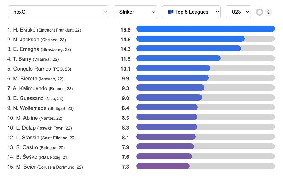 Теперь к главному – к реализации. Да, он много мажет. Но посмотрите на это с другой стороны: по показателю ожидаемых голов без пенальти (npxG) среди игроков до 23 лет в топ-лигах он второй в мире (14.8), уступая лишь Юго Экитике.