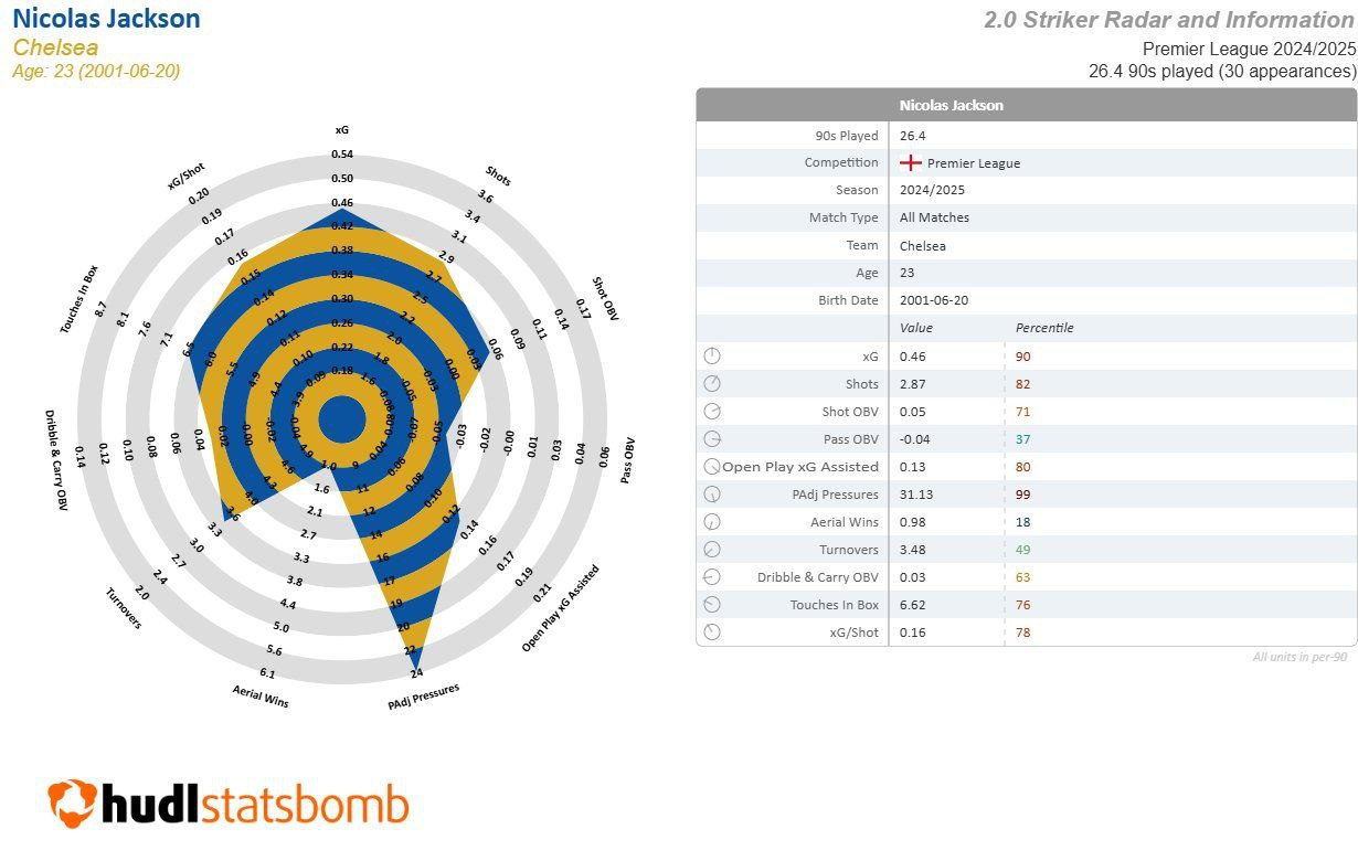 Джексон – это ходячий хаос для любой обороны. Как показывает аналитика, по количеству касаний в штрафной площади он находится в элитной группе «Киллеров» рядом с Холандом и Исаком. Он буквально живет в самой опасной зоне на поле. Постоянно открывается, ищет мяч, стягивает на себя по два защитника. Даже когда он не получает пас, он своим движением создает огромное пространство для партнеров, будь то Палмер, Нету, Делап или любой другой игрок атаки.