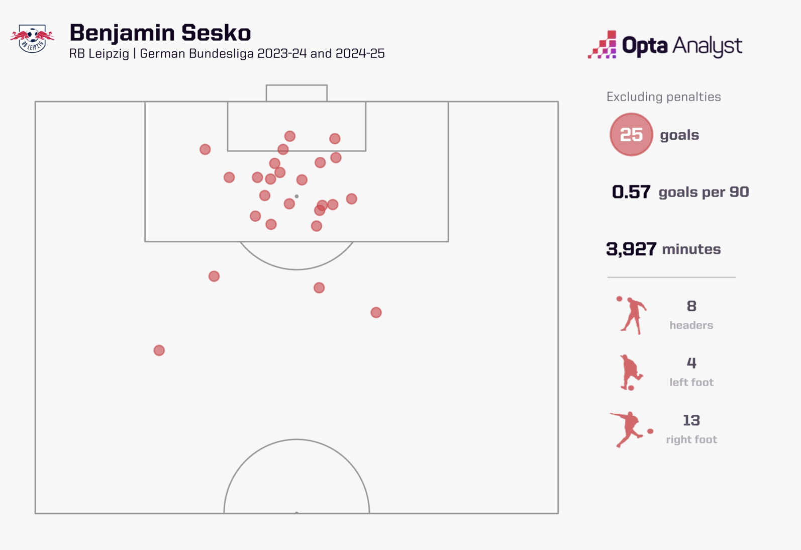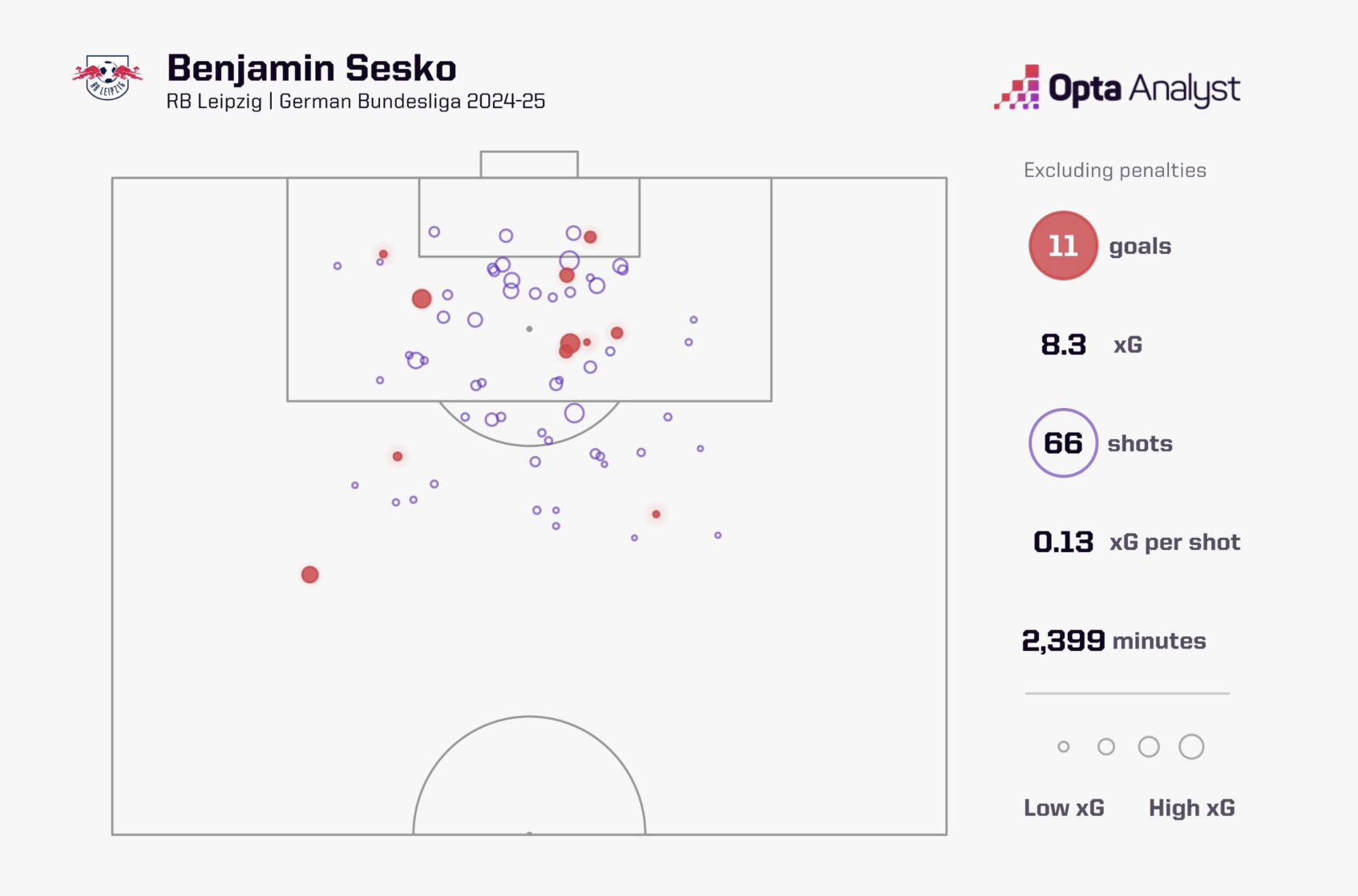В первом сезоне за «Лейпциг» он казался чистым завершителем. Играл близко к воротам, 13 из 14 голов в Бундеслиге — из штрафной. 0.82 гола за 90 минут — третий показатель в чемпионате после Кейна и Гирасси. Всё выглядело логично: огромный, быстрый, бьёт с обеих ног и головой.