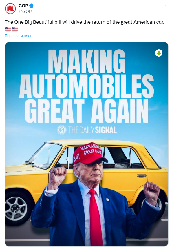 На днях в ее официальном аккаунте появился пост в поддержку закона, который называется The One Big Beautiful bill (буквально – «Большой прекрасный законопроект»). Автор написал, что эта инициатива сделает американский автомобиль вновь великим, а ниже фото Дональда Трампа в фирменной кепке с его слоганом, а на заднем плане – желтое авто.