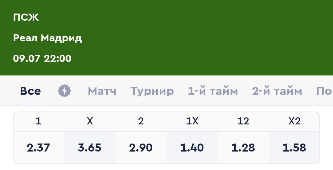 ✏️ Перейдем к конкретному примеру - матч ПСЖ с «Реал Мадридом» 9 июля. Основное время матча может завершиться только одним из 3 событий: победа ПСЖ (коэффициент = 2.37), ничья (3.65), победа «Реал Мадрида» (2.90).