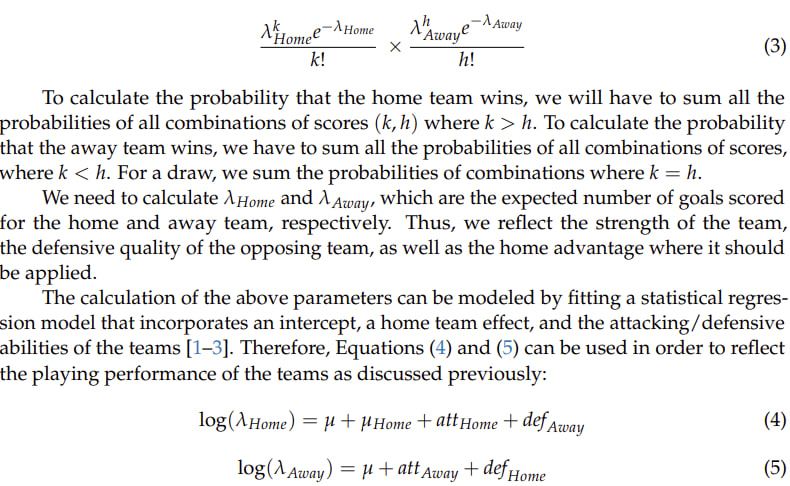 Немного духоты про используемые методологию в статье. Если вкратце, авторы рассчитывают вероятности разного количества голов отдельно для хозяев матча и для гостей, используя распределение Пуассона на актуальных данных (3). Для расчёта оценки математического ожидания (коэффициент lambda) используется Пуассоновская регрессия, где в качестве параметров используются способности команд атаковать и защищаться дома/в гостях и фиксированный эффект для хозяев встречи (4, 5). Исходя из вероятностей конкретного количества голов для каждой команды, авторы рассчитывают вероятности победы хозяев, победы гостей и ничьи во встрече.