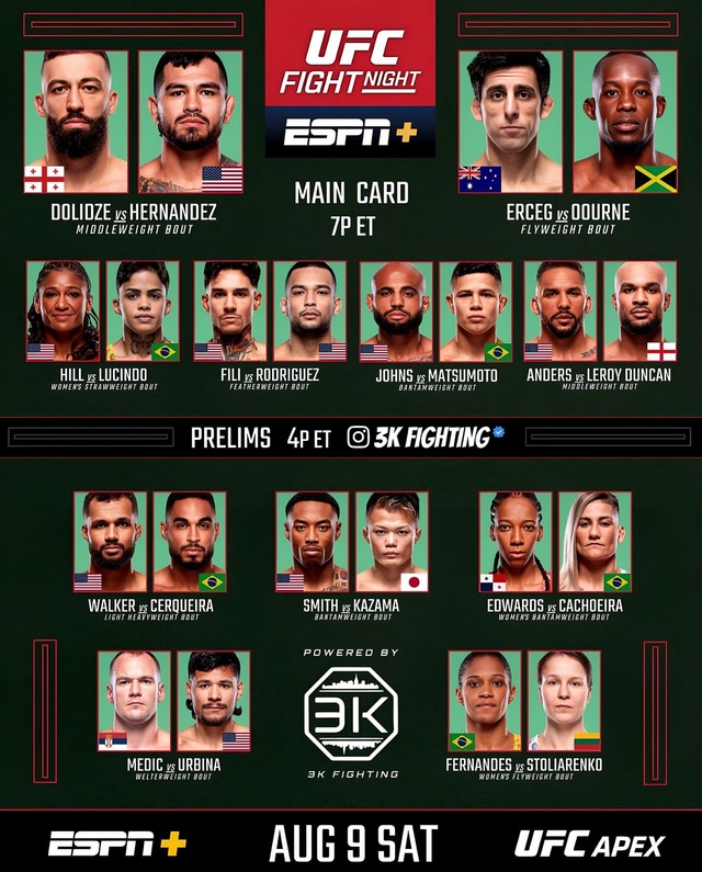 9 августа в UFC Apex состоится очередной UFC on ESPN 72, который возглавят Роман Долидзе и Энтони Эрнандез. Глядя на кард, очень трудно найти статусный поединок, сравнимый с теми, что наполняют карды арабских турниров. Однако я все же попробую что-нибудь интересное. Предупрежу сразу, превью получится короче обычного, поскольку и турнир, мягко говоря, не очень высокого уровня.