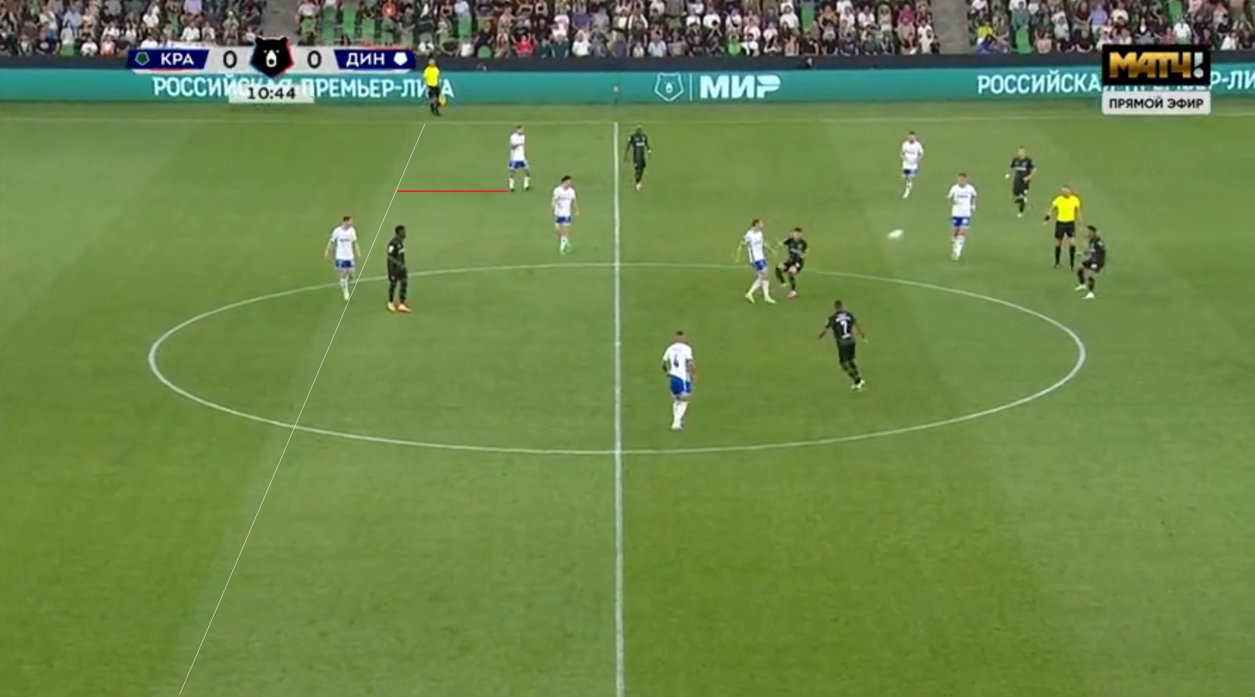 Под конец тайма Динамо стало позволять ближе подходить сопернику к нашим воротам, что однажды привело к ещё одному полумоменту. В этот раз мы отбились количеством. Для экономии сил и увеличения плотности игроков у штрафной Динамо перестроилось на 5 защитников, а высоченный новый центр обороны (Александров\Кутицкий) несколько раз выигрывали верховые мячи, правда Краснодар был всегда первым на подборах.