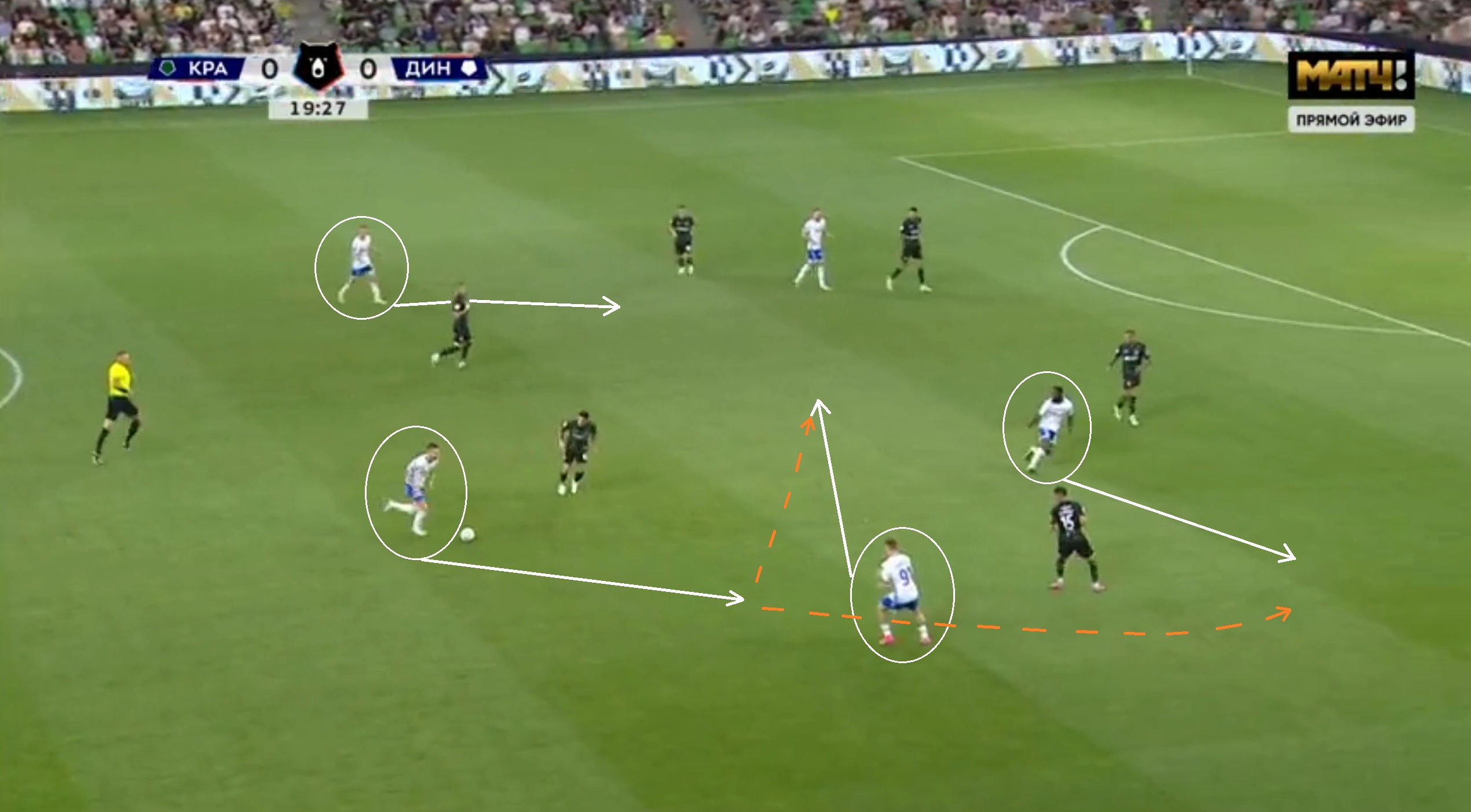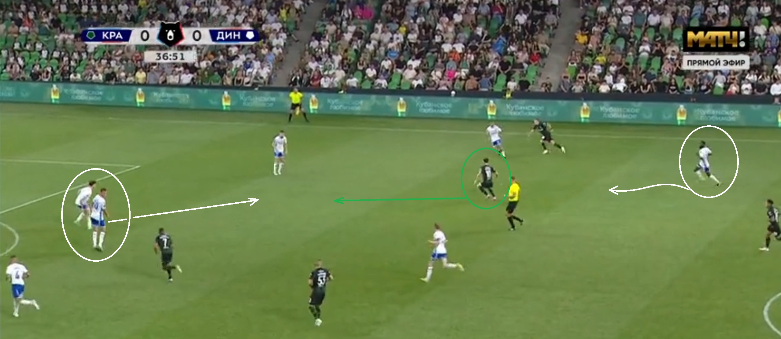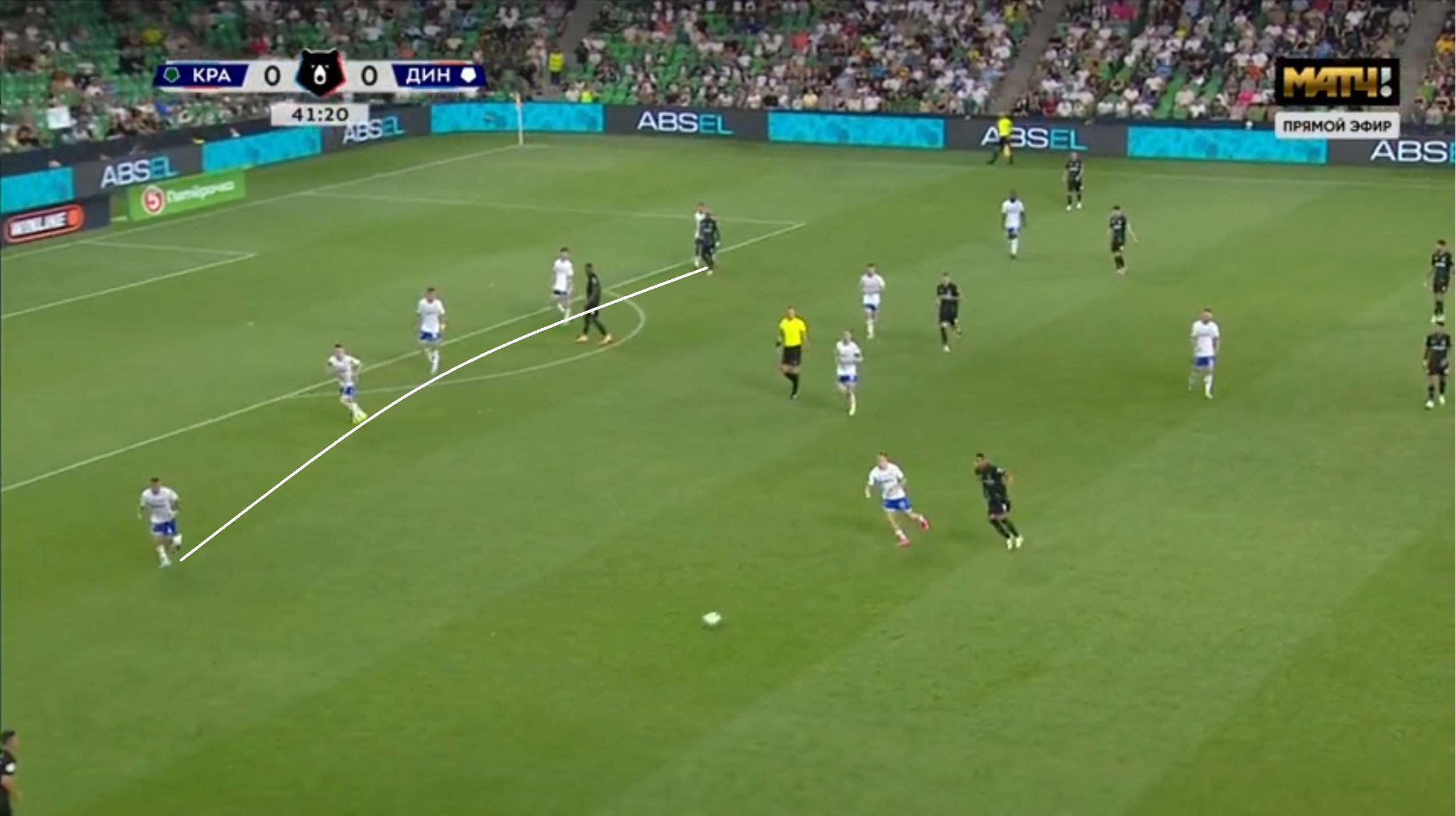 В дальнейшем Краснодар полностью перехватил инициативу, Динамо успешно отбивалось, а всё тот же Муми в редких контратаках продолжал отдавать передачи сопернику вместо Сергеева. Если мы снова взглянем на наш состав, то увидим, что на поле у нас только два выраженных созидателя: Николя и Ярослав. И именно их пассивная и неточная игра является ответом на вопрос «а где атака у Динамо?». Надоев ждать хоть какой-то активности от полузащитников, Карпин меняет Гладышева на Макарова, однако Денис за 30 минут, кроме одного прохода и паса на Муми, ничем не запомнился. И я честно не понимаю, почему нельзя было выпустить того же Скопинцева вместо Нгамалё?! Хуже бы точно не стало, а хоть какая-то острота у чужих ворот могла бы появиться. Ещё до первой замены можно было отметить активность нашего новичка в обороне. Во время позиционной атаки Краснодара Рубенс резко выдвинулся вперёд, однако не смог помешать Батчи обработать мяч в касание, тем самым создав свободную зону на своём фланге для Петрова. Бразилец сразу попытался накрыть его, но было поздно — навес в штрафную, где Черников не смог пробить головой. В принципе, такие рискованные действия Рубенса понятны и вызваны позиционной потерей Глебова своего оппонента. И даже не успев на перехват, защитник рванул обратно к Петрову. То есть понимание игры у него побольше, чем у других наших игроков. Кстати, эта атака Краснодара из той же темы 2-в-1: вначале отыграли Муми, а затем Рубенса.