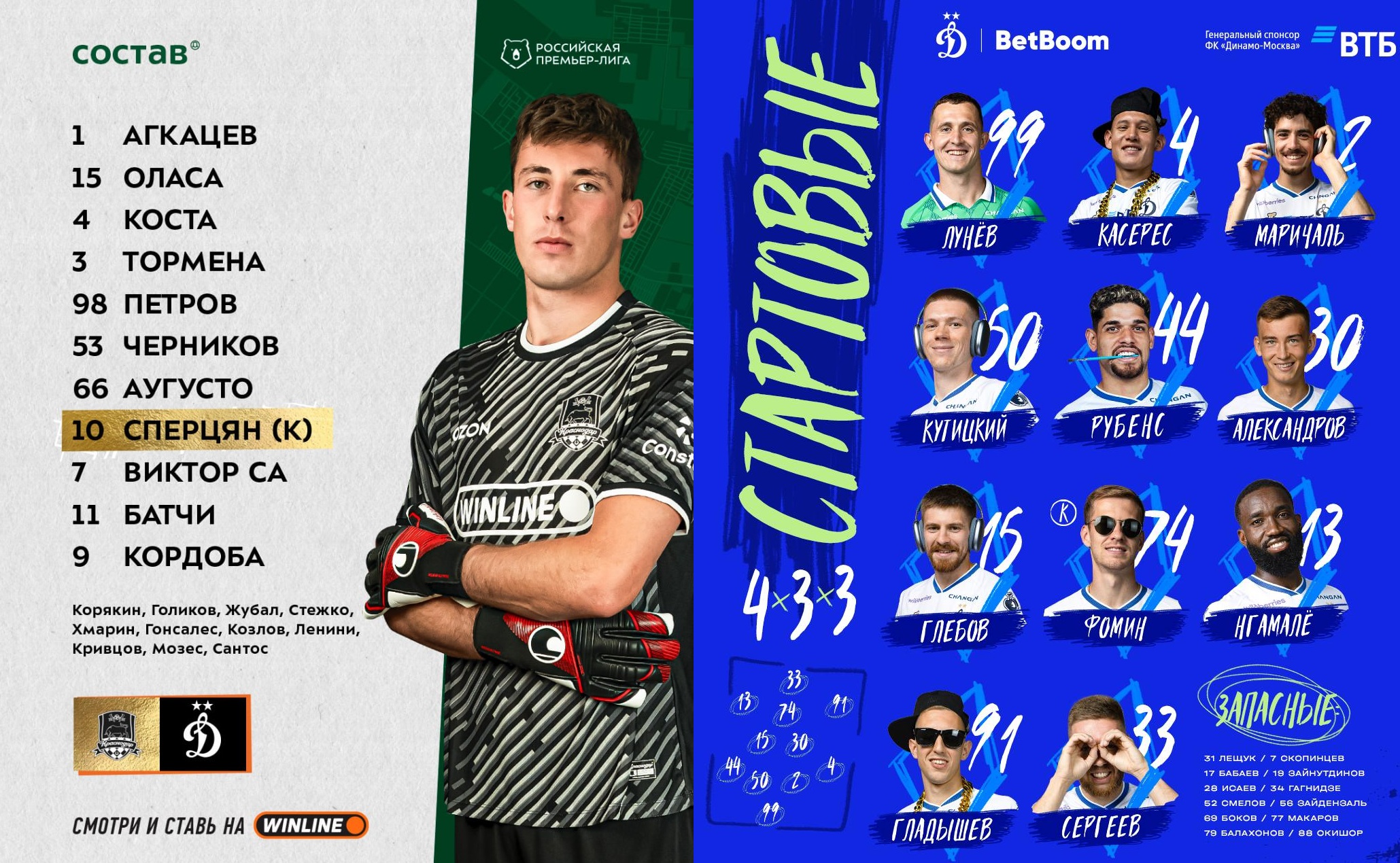 Первый выезд в сезоне и первое статусное испытание — мы не просто в очередной раз едем в Краснодар, а едем к чемпиону, который уже успел проиграть дома дважды. А до этого пришлось помучиться против Пари-НН в начале первого тура. Всё это, даже на фоне качества нашей игры, всё равно оставляло нам шансы не проиграть. Однако когда стало известно, что на выезд не поехало сразу несколько ключевых игроков Динамо, я поменял свой прогноз в конкурсе с 1:1 на 2:0… К помимо серьёзно травмированных в лазарет добавились Осипенко, Фернандес, Лаксальт, Бителло и Маухуб. Из опытных игроков в запасе только Скопинцев и Макаров. Зайнутдинов ещё привыкает к команде, хотя это не помешало дебютировать бразильскому новичку Рубенсу. С другой стороны, выбора у Валерия Карпина не было. Добавим к этому известную форму (точнее — её отсутствие) Гладышева и Нгамалё — и становится понятно, почему после матча в графе «удары в створ ворот» у нас красовалась баранка. Однако даже эта игра показала одно большое изменение. При Личке было очень много разговоров, что он играет в атаку, меньше уделяя внимания обороне и многие его за это недолюбливали. И вот, «по просьбе трудящихся», в Динамо всё разворачивается на 180 градусов: атаки почти нет, но мы пропускаем всего один гол! Повторю: имея большие кадровые проблемы, мы пропускаем всего один гол от действующего чемпиона, который до этого проиграл дома дважды! Поражение это, конечно, всегда неприятно, но одно дело проигрывать 0:4 к 25-й минуте (первое кубковое дерби Лички), и совсем другое пропускать на 87-й минуте от лучшего игрока прошлого чемпионата. Кстати, ещё замечание по составу команд: у Краснодара вышло только три россиянина, а у Динамо — семь. Вышедшие на замену у хозяев три легионера и Кривцов, у Динамо — три россиянина и казахстанец Зайнутдинов.