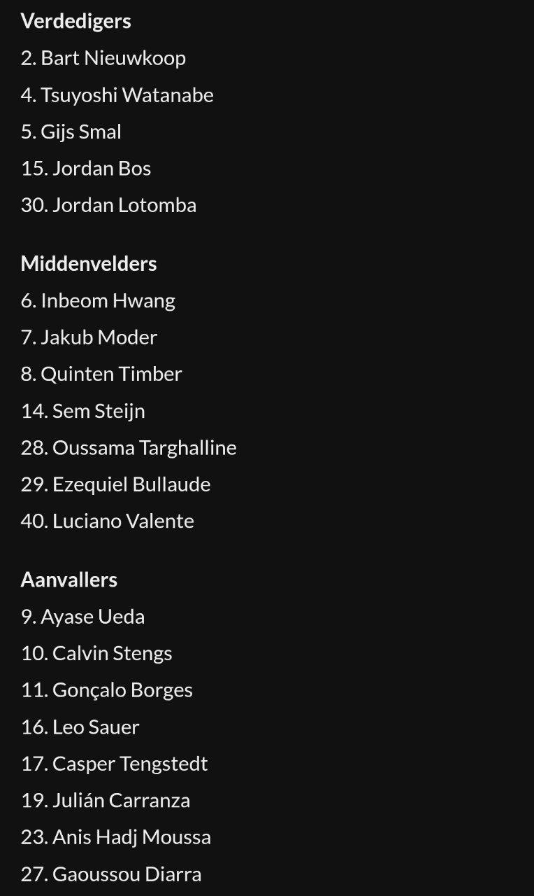 Вот такая была заявка на этот матч. Скажу сразу, что Смал выбыл из заявки из-за травмы. Отсутствует Траунер, тоже на травме. На позицию ЦЗ Ван Перси собирался поставить полузащитника поляка Модера. Но вот незадача, Якоб не до конца восстановился и не факт, что сможет принять участие. Таким образом у Голландского гранда огромные проблемы в этой зоне. Либо выйдет неготовый Модер, для которого эта позиция неродная. Или же выйдет молодой Крайевельд, который еще не играл в официальных матчах за «Фейеноорд», но в товарищеских матчах заигрывался