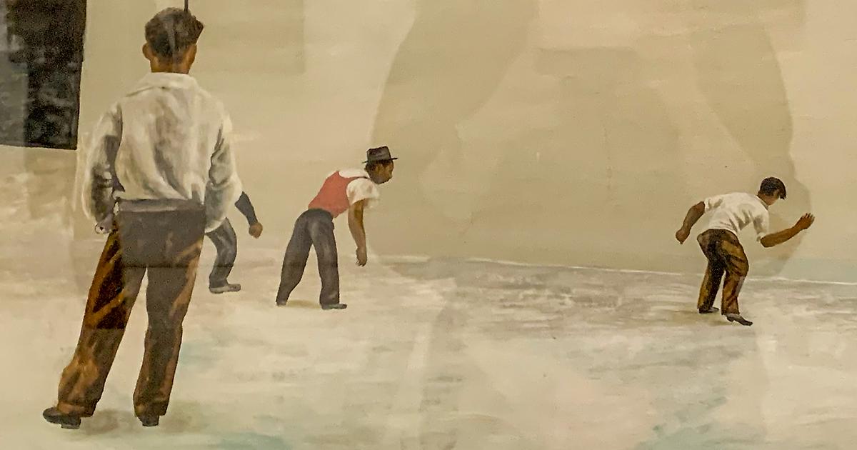 На картине изображена сцена уличного американского хендбола, популярного в США с начала XX века и особенно в 1920–1940-х годах. Это не командный гандбол, а народная игра — one-wall handball, в которую играют один на один или в парах, отбивая рукой небольшой резиновый мяч о стену. Он считался доступным и демократичным занятием для рабочего класса