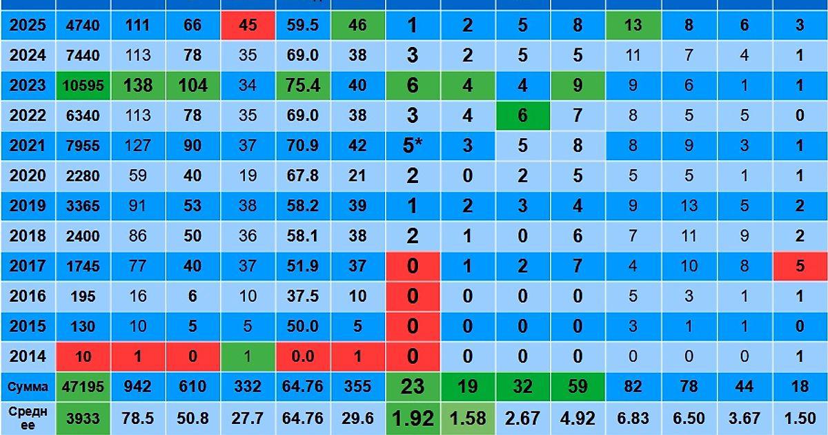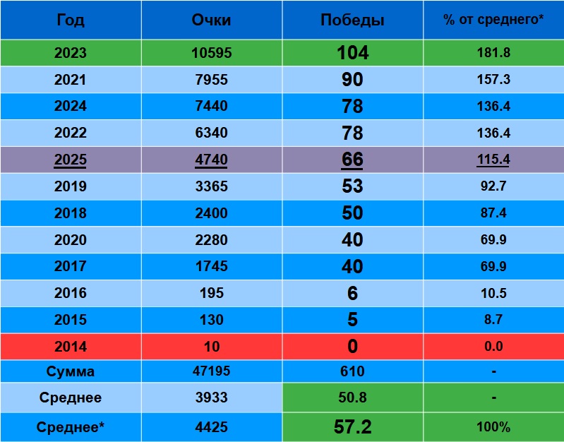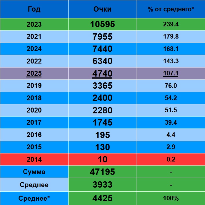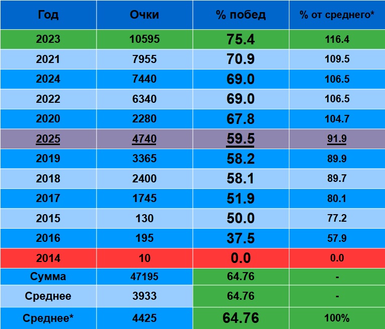2023 – первый, 2021 – второй, 2024 и 2022 – разделили 3-4 место. 2025 – пятый. Тут все неплохо, игр(111) сыграно немало, больше, что «Среднего»(78.5), что «Среднего*»(88.3).
