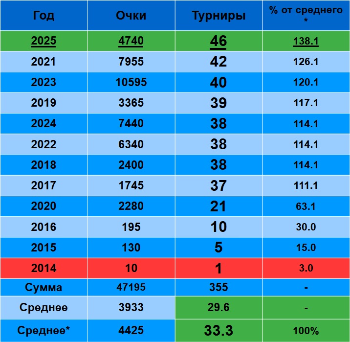 А тут и вовсе, 2025 год – первый! Никогда наша тройка не играла так много турниров. 2021 на втором месте, 2023 на третьем.