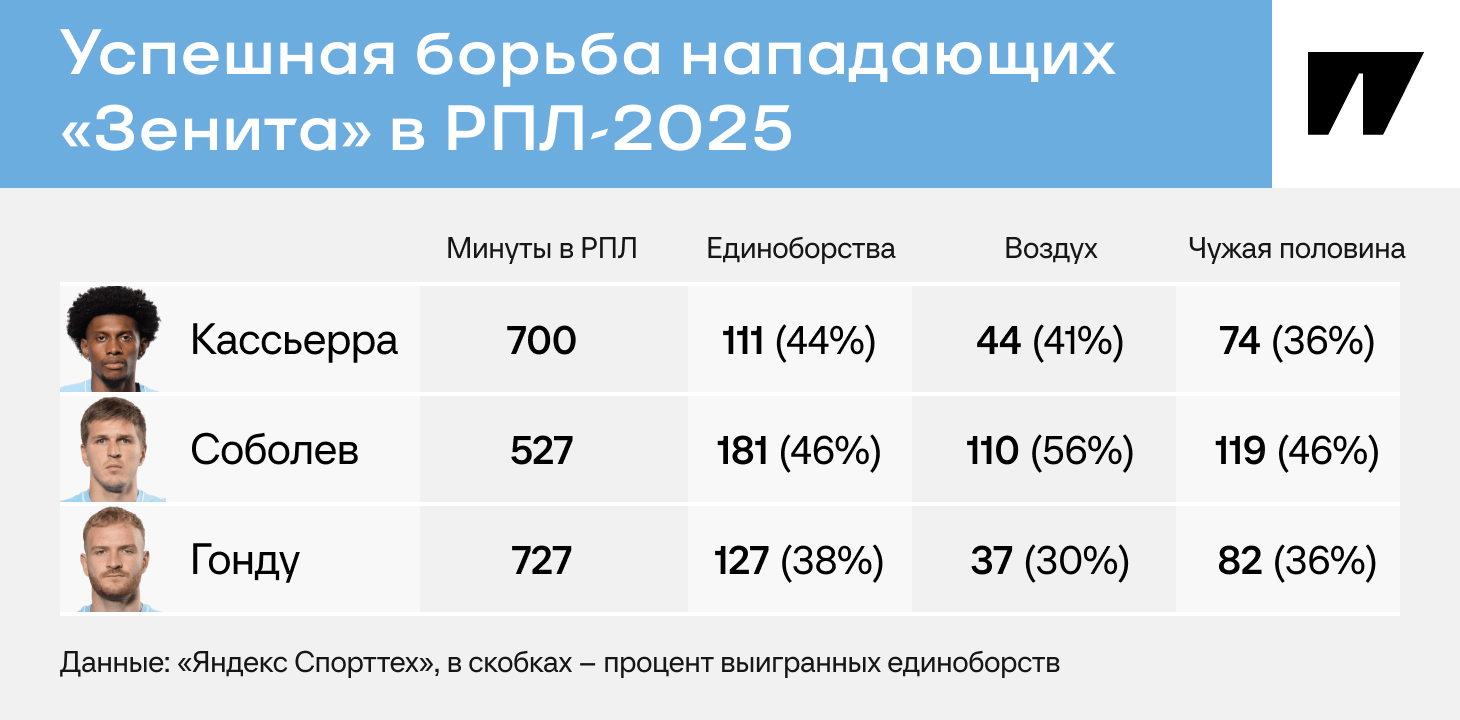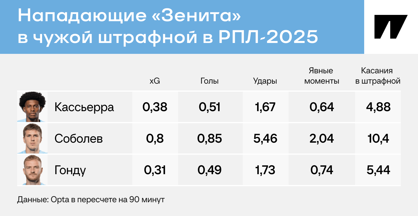 У «Зенита» три центральных нападающих: легковесный Матео Кассьерра (717 минут в РПЛ-2025), наглый и универсальный Лусиано Гонду (739 минут) и стенобитный Александр Соболев (533 минуты). При этом футбол Сергея Семака сейчас предполагает силовых форвардов – команда третья в РПЛ-2025 по навесам, вторая по забросам вблизи штрафной, лидер по кроссам без учета угловых.