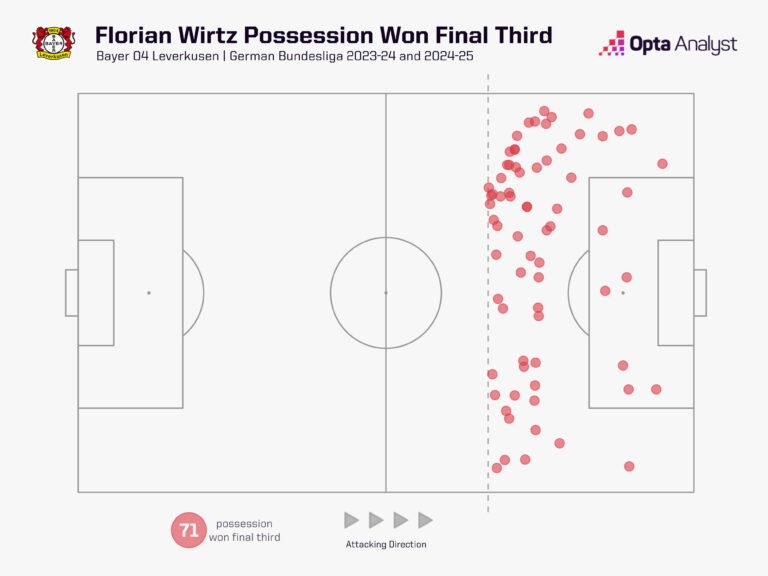 Однако настоящим открытием последних сезонов стала его выдающаяся работоспособность. В минувшем чемпионате Виртц установил лучший показатель в Бундеслиге по количеству успешных отборов в атакующей трети - 1.25 за матч среди футболистов, проведших на поле 1500+ минут. Еще более впечатляет его кумулятивное достижение: за два последних сезона немец на 15 перехватов превзошел всех конкурентов лиги, доведя счет до 71 успешного отбора в атаке.