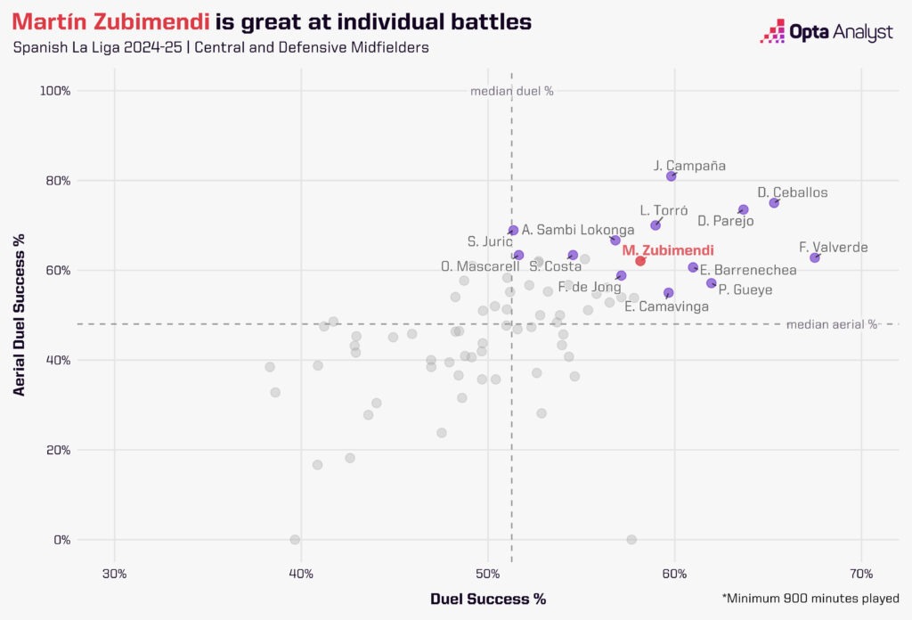 Субименди — не классический «разрушитель» в центре поля, но он эффективно отбирает мяч (как видно на графике ниже). Комбинация этого навыка с характерным для испанских полузащитников видением поля и умением находить партнёров разрезающими передачами создает значительную угрозу для соперников.
