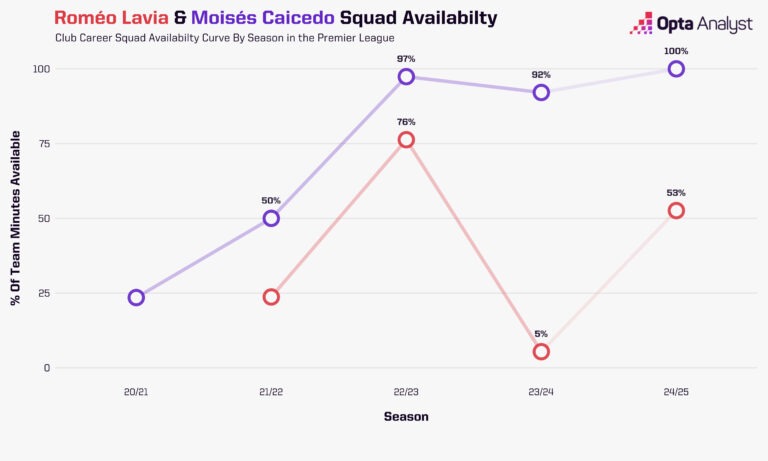 Два года на «Стэмфорд Бридж» сложно назвать успешными для бельгийского полузащитника. Практически весь дебютный сезон он пропустил из-за травмы, а в 2024/25 вновь надолго выбыл из строя. Если сравнить его игровое время с напарником по полузащите Мойсесом Кайседо, разница окажется разительной – Лавиа едва ли мог помочь команде, проводя больше времени в лазарете, чем на поле.