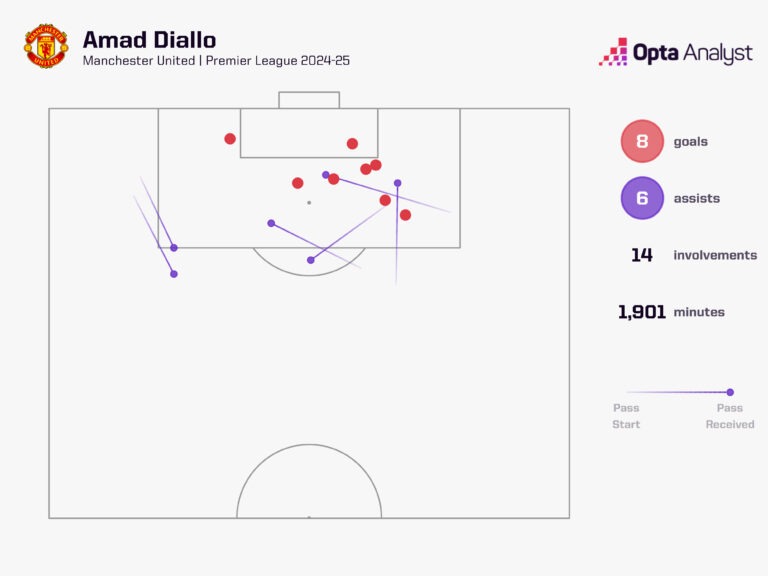 Что касается его влияния в атаке, то здесь цифры говорят сами за себя: среди игроков, проведших в Премьер-лиге не менее 1500 минут в прошлом сезоне, только 11 футболистов опередили Амада по показателю участия в голевых моментах (без учёта пенальти) в расчёте на 90 минут (0.66).