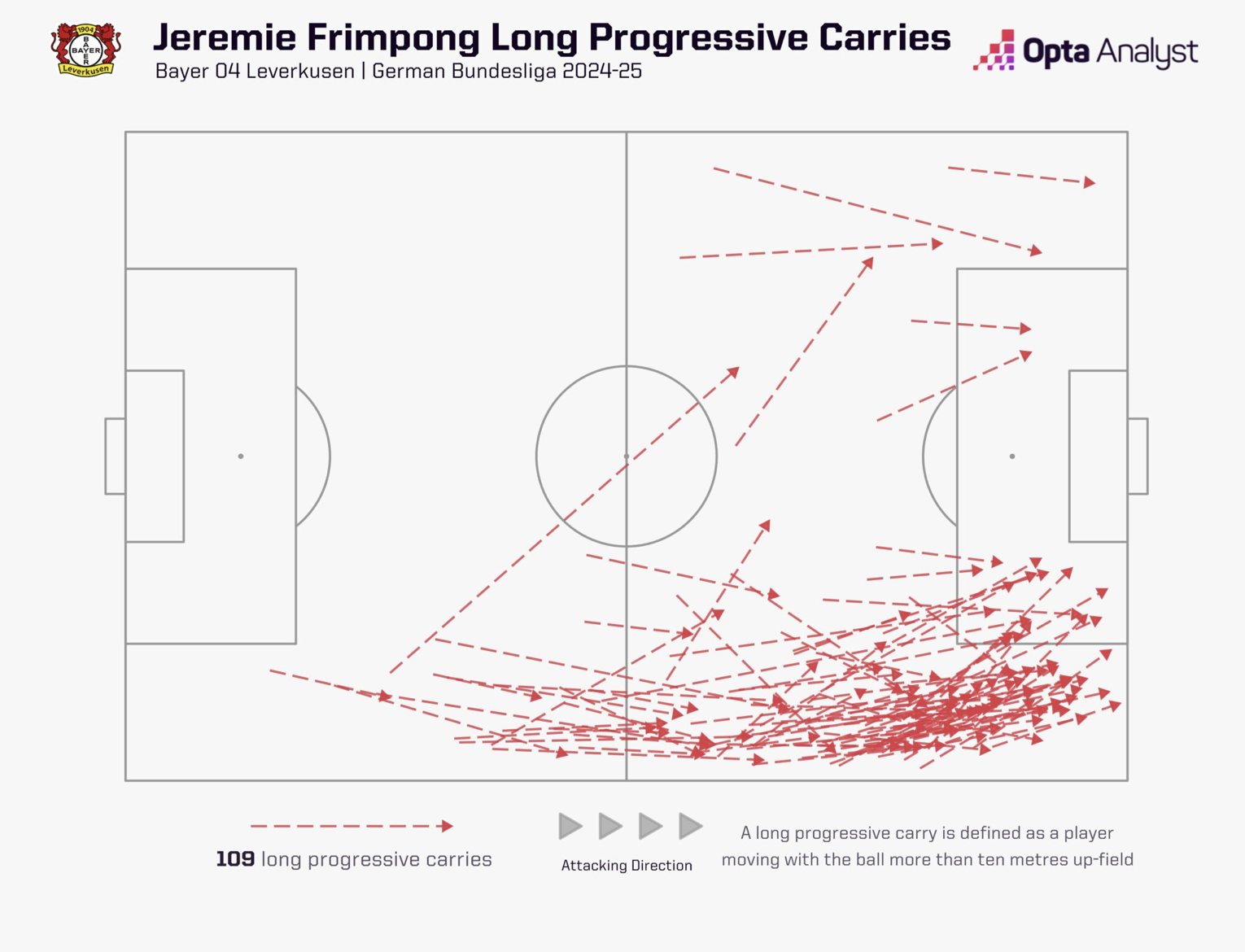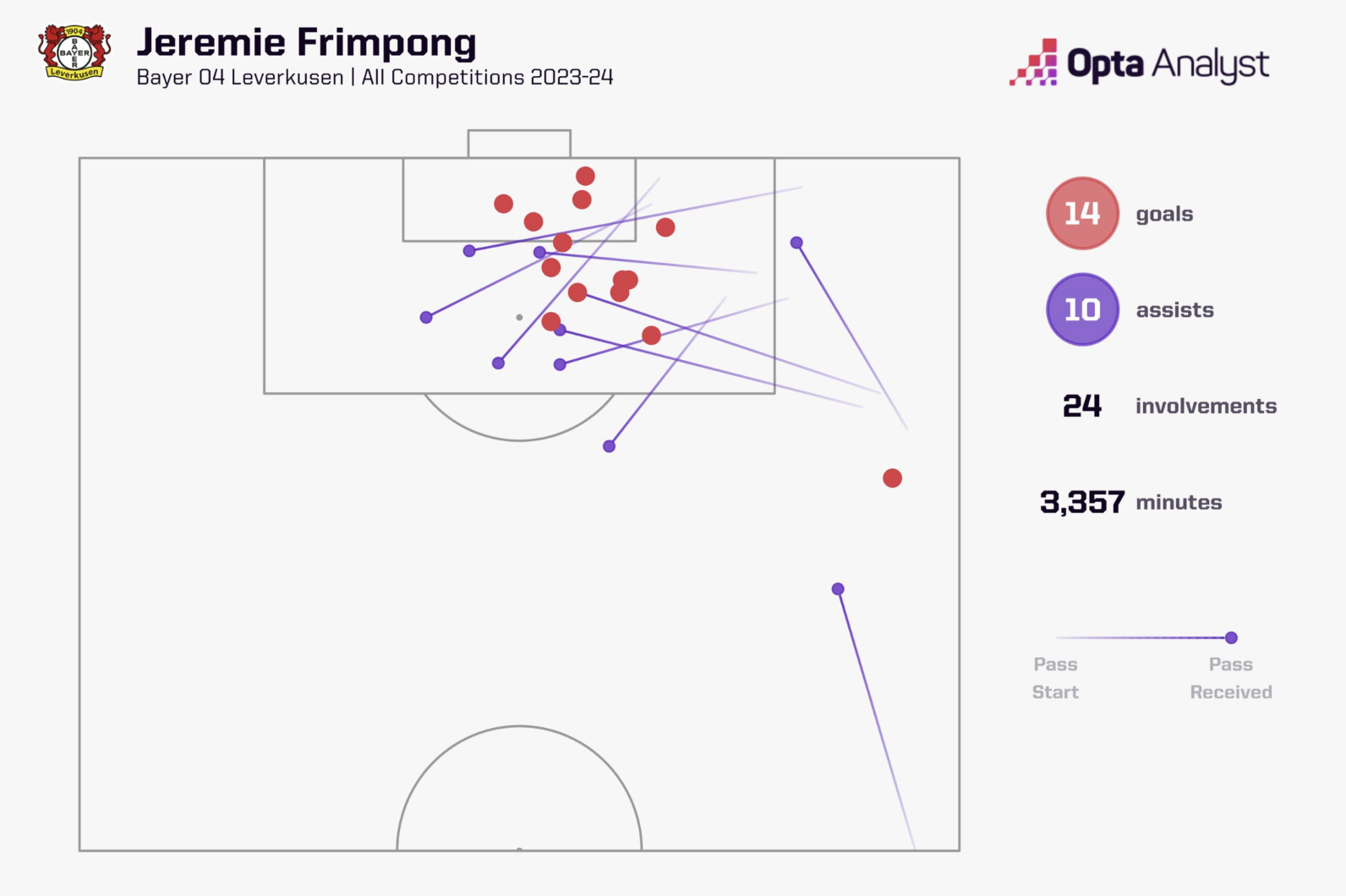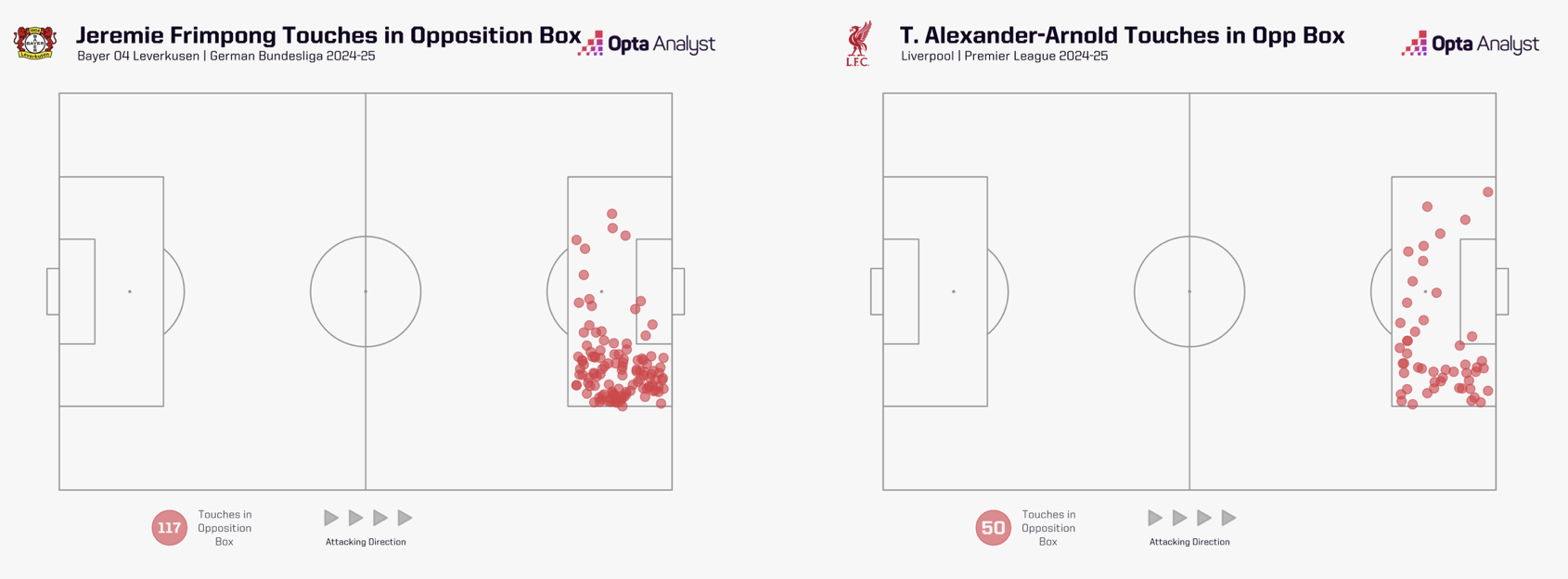 Фримпонг действует ближе к чужой штрафной, чем любой другой защитник лиги. 117 касаний в штрафной — третье место в команде. Только Вирц и Шик чаще получали мяч в чужой зоне. У Трента таких касаний — меньше двух за матч, у Фримпонга — больше четырёх.