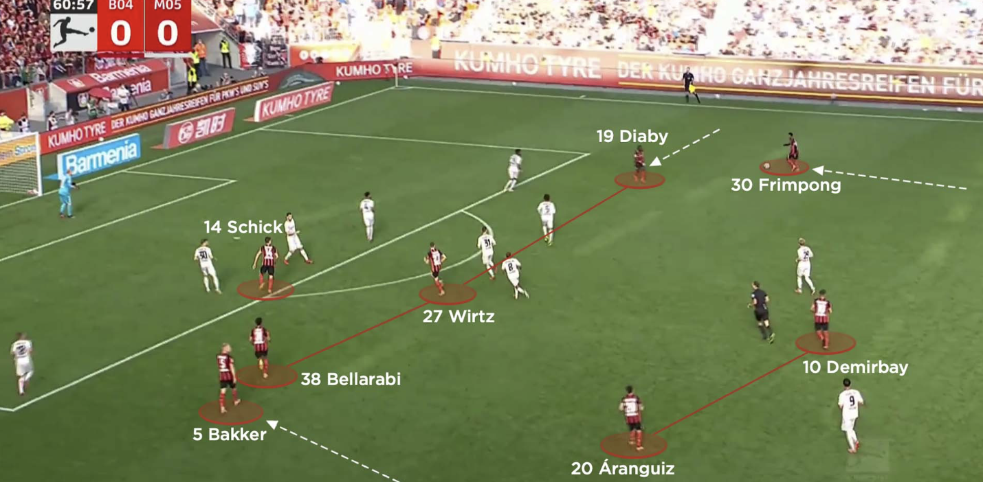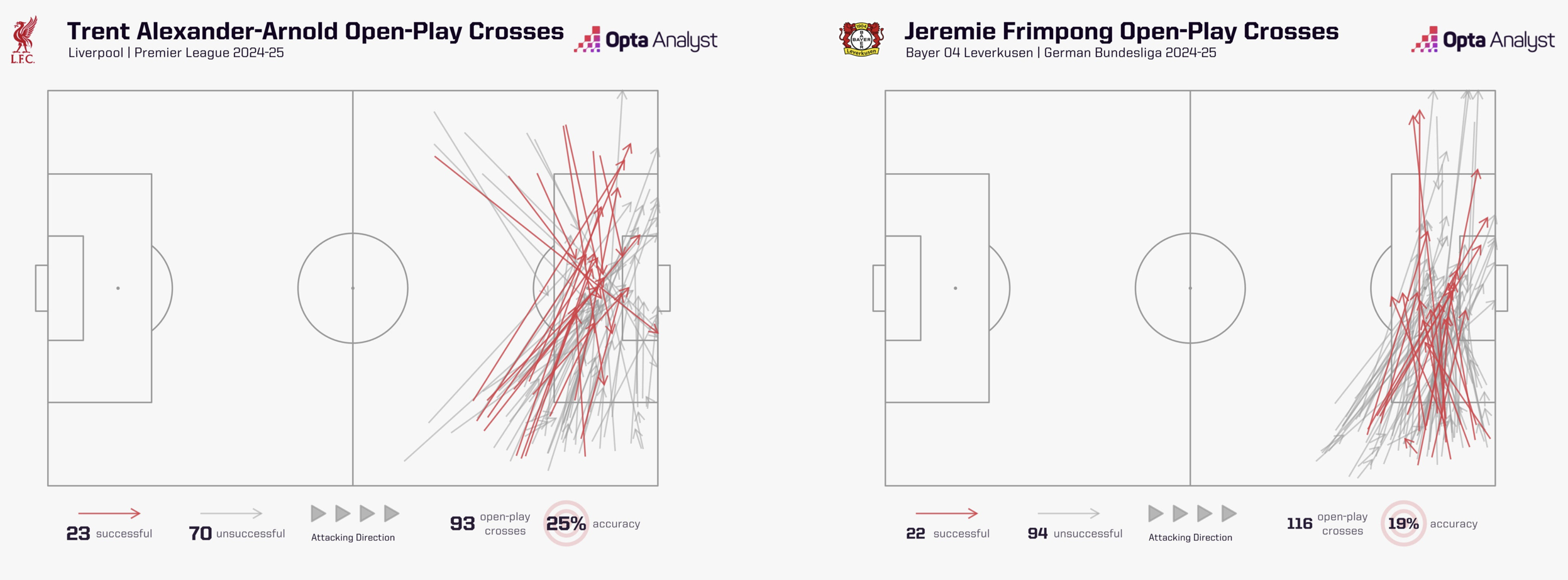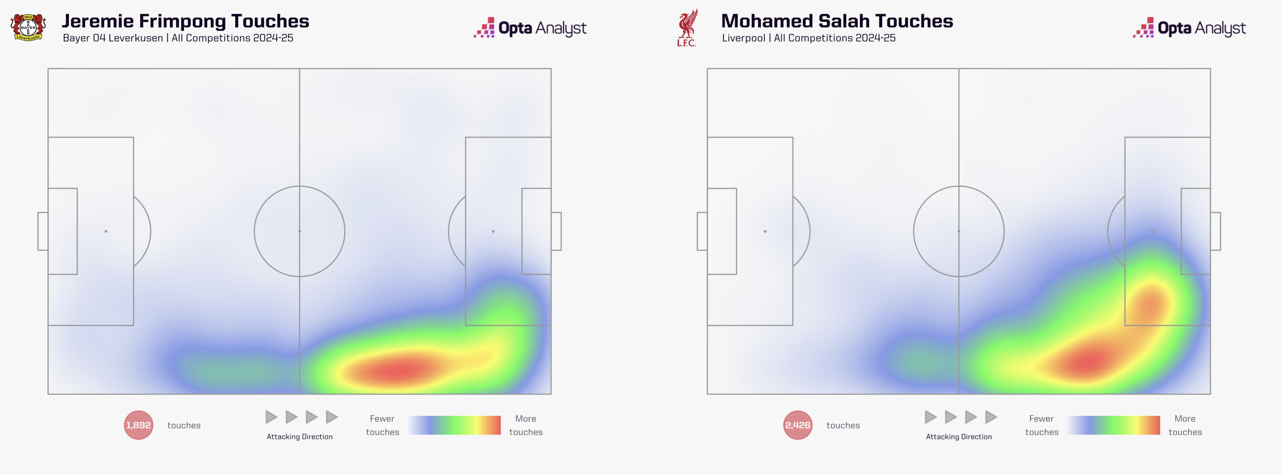 Фримпонг действует ближе к чужой штрафной, чем любой другой защитник лиги. 117 касаний в штрафной — третье место в команде. Только Вирц и Шик чаще получали мяч в чужой зоне. У Трента таких касаний — меньше двух за матч, у Фримпонга — больше четырёх.