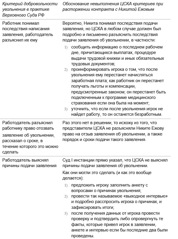 ЦСКА со своей стороны сделал классические ошибки, за которые и поплатился, хотя достаточно было установить наличие волеизъявления (которое здесь очевидно, т.к. было 2 заявления от игрока), а также добровольность увольнения игрока, о чем неоднократно писал Верховный Суд Российской Федерации в Определениях от 01.02.2021 № 14-КГ20-14-К1, от 16.08.2021 № 56-КГПР21-11-К9, от 14.11.2022 № 35-КГ22-7-К2: