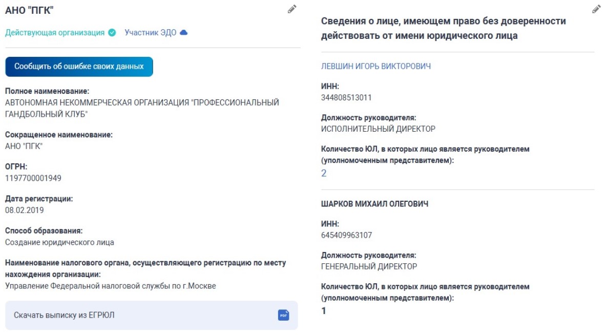 Когда готовил материалы дела, то заметил, что Игорь Левшин (исполнительный директор юридического лица ЦСКА – АНО «Столичный центр развития гандбола») стал и исполнительным органом в юридическом лице женского ЦСКА – АНО «Профессиональный гандбольный клуб»: