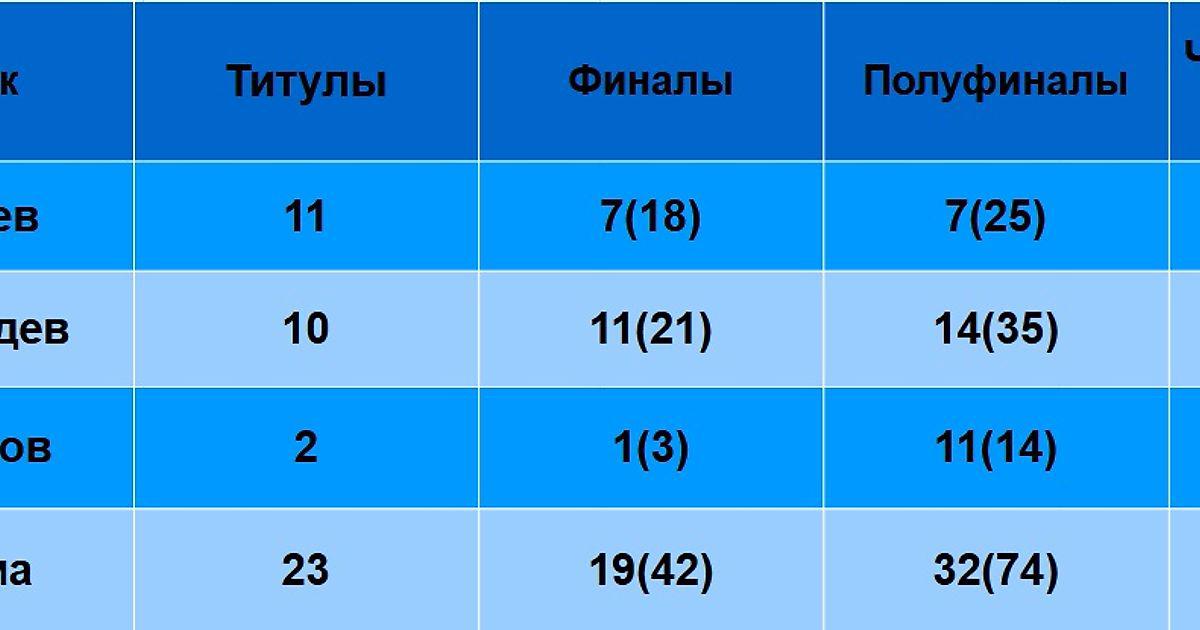 В скобках указано количество выходов в данную стадию. Например, Рублев 18 раз выходил в финал. 7 раз там проиграл, а 11 раз взял титул.
