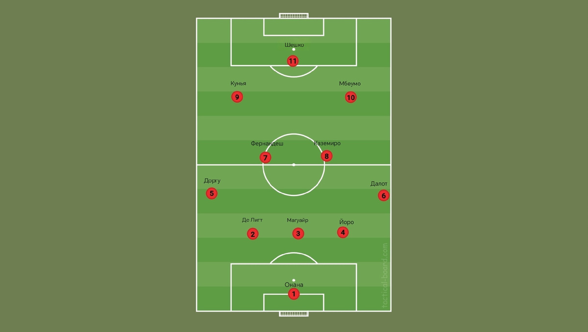 Бруно Фернандеш скорее всего опуститься «глубже» в позиции, так как надо будет на поле уместить новых игроков. Либо можно будет поставить Кунью центральным нападающим и Бруно поставить атакующим полузащитником. За вторую позицию будут бороться три игрока Каземиро, Угарте и Майну. Все игроки больше оборонительного плана, с такими игроками и такой схемой, точно в основном составе будет ярко выраженный опорный полузащитник.