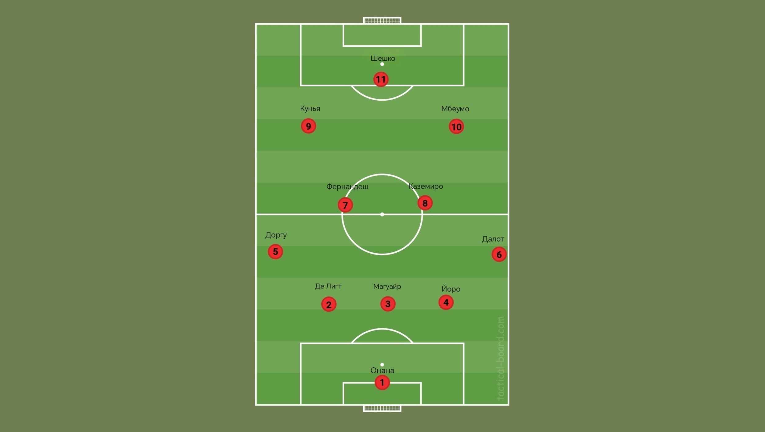 Аморим будет играть по такой схеме, скорее всего так будет выглядеть основной состав, если по вратарю вопросов нет, то по другим позициям могут быть разные варианты.
