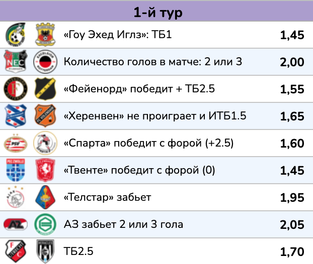 «Спарта» сохранила и костяк, и тренера Мориса Стейна, что обеспечит надежную игру у своих ворот, в прошлом сезоне больше 2 голов роттердамцы пропускали при нем только один раз. Если предположить, что ПСВ пропустит, то для прохода ставки «фора (-2,5)» хозяевам нужно забивать целых 4 раза, что в условиях практически нового состава видится сложно реализуемой задачей против «Спарты».