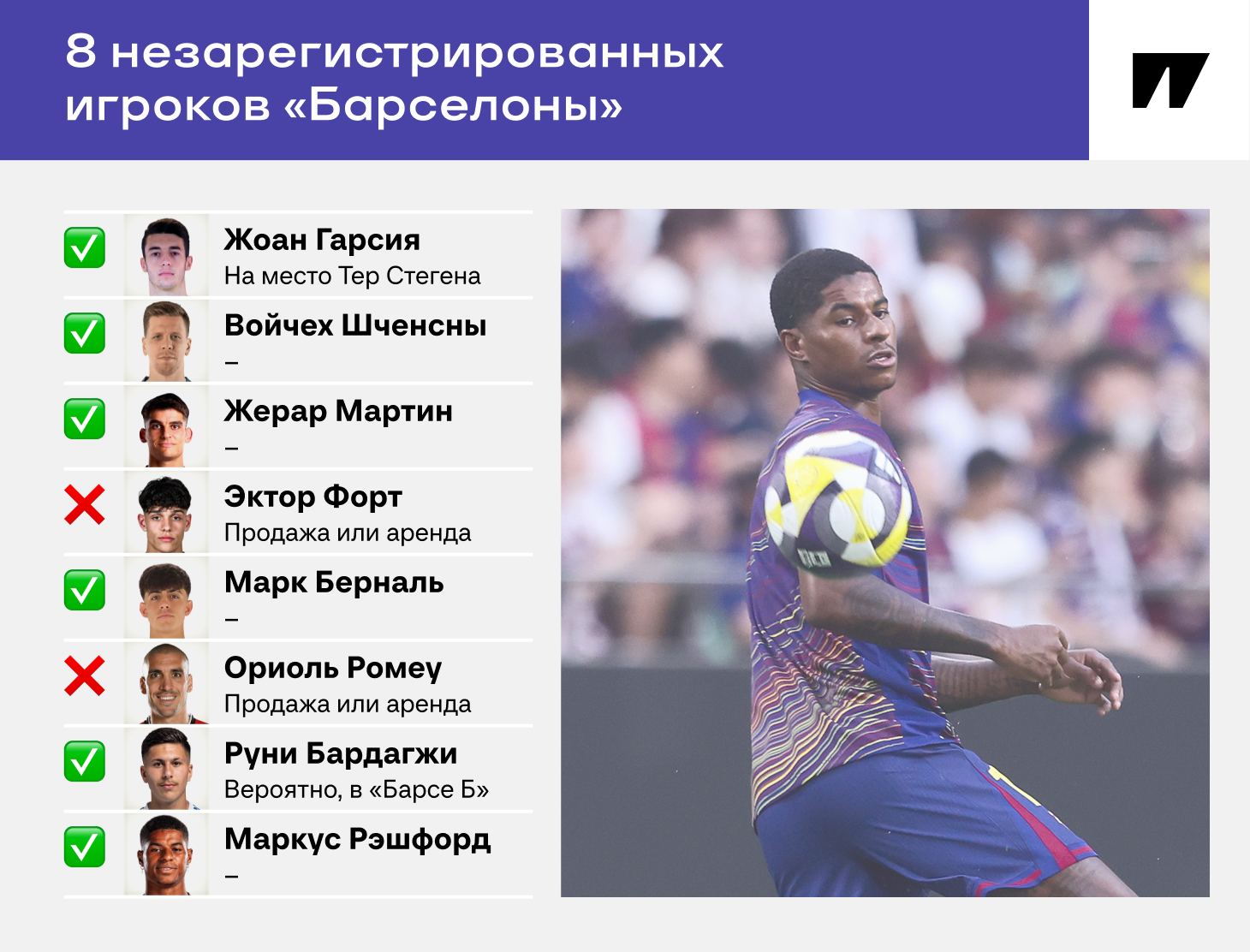 Должны внести в заявку вратаря Жоана Гарсию, помогла травма Марка-Андре тер Стегена. Он в итоге подписал медицинское заключение, так что капитанство ему вернули – говорит, о проблемах с регистрацией, если бы настаивал на изначальном трехмесячном сроке восстановления, не знал.
