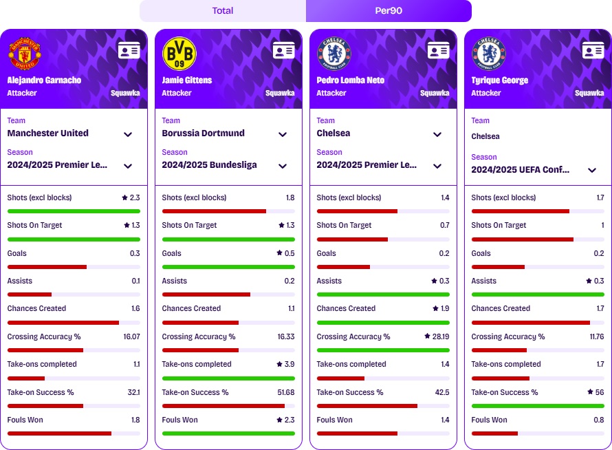 Что касается дриблинга, здесь выделяется Гиттенс — 3,9 успешных проходов за матч с 51,68% успеха. Джордж демонстрирует лучший процент успеха (56%), но меньше попыток, а Гарначо совершает лишь 32,1% своих дриблингов. Таким образом, если «Челси» нужен вингер с ударными качествами — Гарначо подходит, но если требуется креативный дриблер — Гиттенс и Джордж выглядят предпочтительнее.