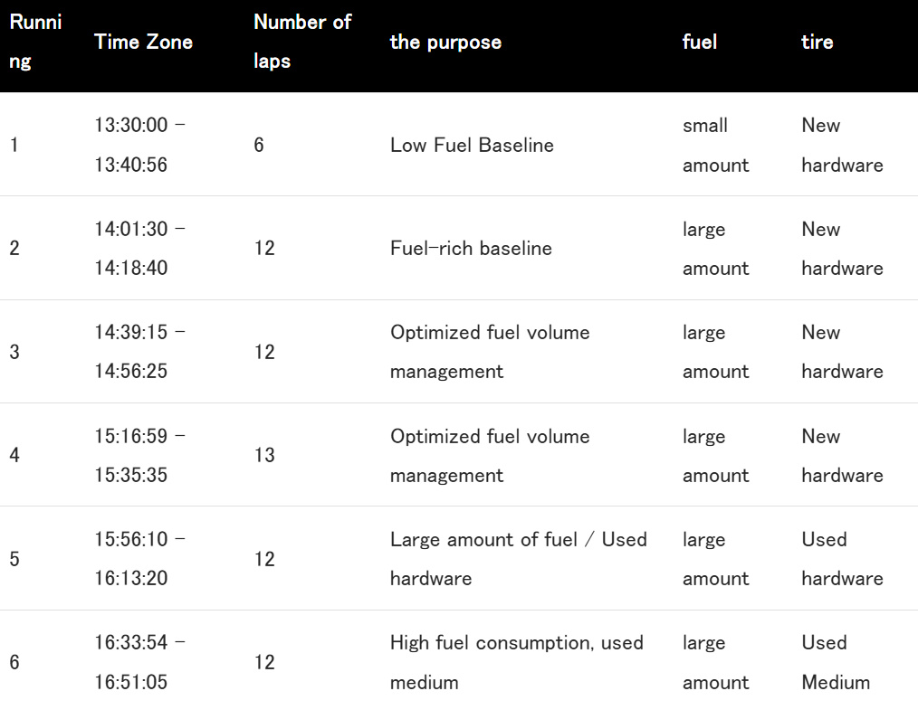 Более того, инженеры поделились подробными планами тестов. Было известно, сколько кругов запланировано проехать, когда именно их собираются провести, что хотят проверить, сколько топлива будет загружено и израсходовано и какие шины будут использованы (вплоть до данных об их состоянии).