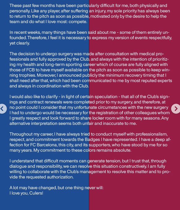 Решение о проведении операции было принято после консультации с медицинскими специалистами и полностью одобрено клубом. Мною всегда двигало намерение уделять приоритетное внимание своему здоровью для долгосрочной спортивной карьеры, что, конечно же, полностью совпадает с интересами «Барселоны». Мы все хотим скорее выйти на поле и продолжить завоевывать трофеи. Более того, я публично объявил о минимальных сроках восстановления, которые мне потребуются после операции, о чем мне сообщили многие известные специалисты. И все это согласовывалось с клубом.