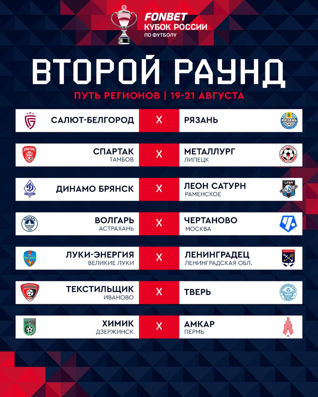 Второй раунд пройдет уже через две недели, с 19 по 21 августа. Пары второго раунды выглядят так. Я отмечу матч «Кристалла-ТЭЗТ» и «Мурома», игру «Калуги» и «Амкала» и противостояние одних из лидеров своих групп во Второй лиге Б вологодского и петербургского «Динамо».