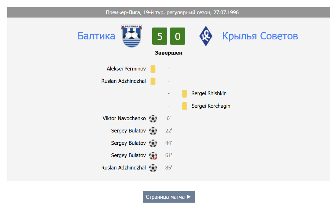 Но и это ещё не всё. Самое крупное поражение «Крыльев» в истории противостояния этих клубов произошло 29 лет назад – ровно за 27 лет до дебюта Ивана Бобра, 27 июля 1996 года. Тогда «Крылья» в гостях уступили со счётом 5:0. В том матче Сергей Булатов (!) оформил хет-трик (!).