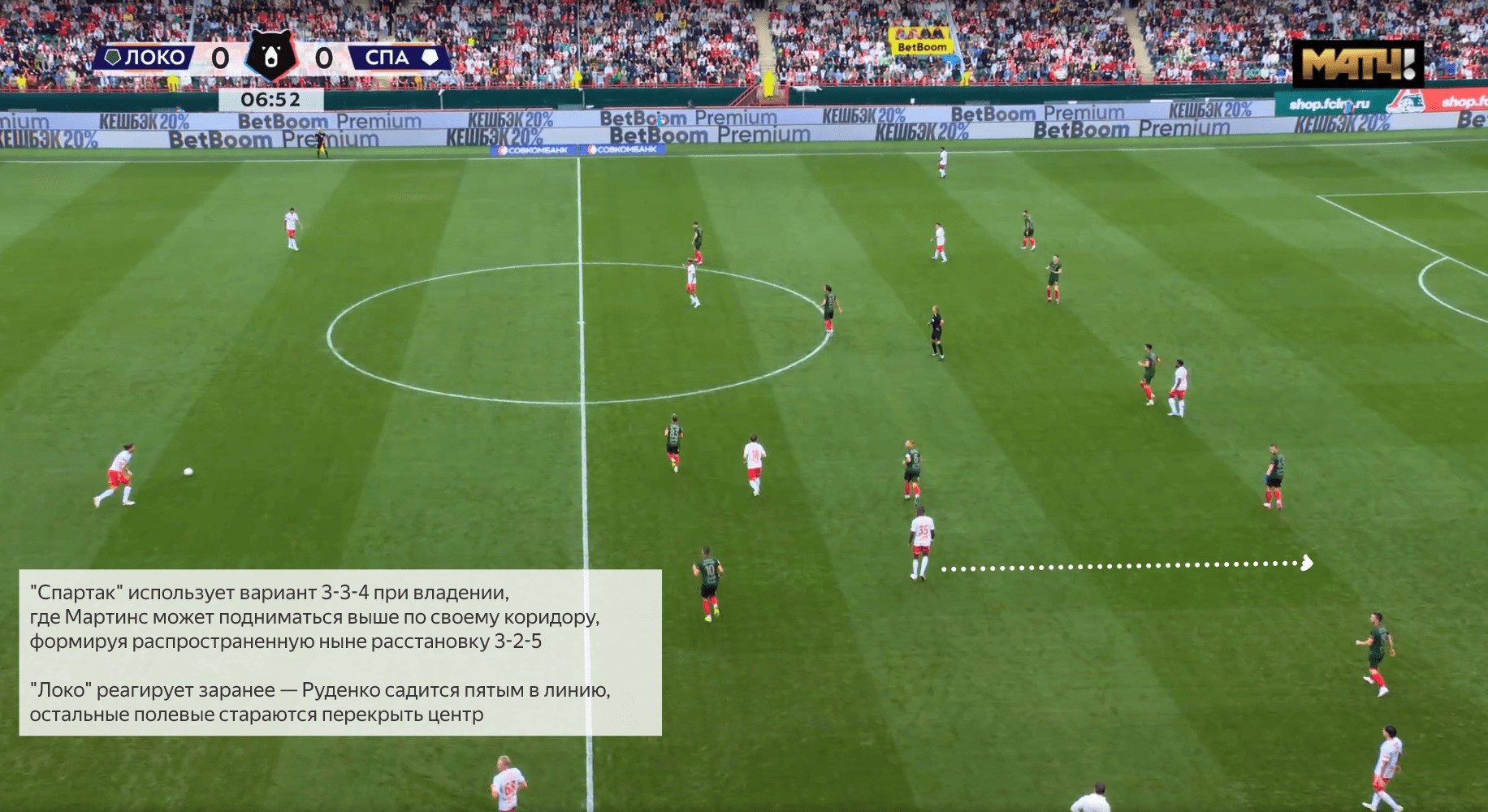 Второе: «Спартак» использовал схему 3-3-4 при владении с переходом на 3-2-5 за счет движения Мартинса. «Локомотив», как и в матче с «Краснодаром», не стеснялся оттягивать вингеров в заднюю линию. И «Спартак» отлично понимал, что именно так и будет играть соперник в дерби.