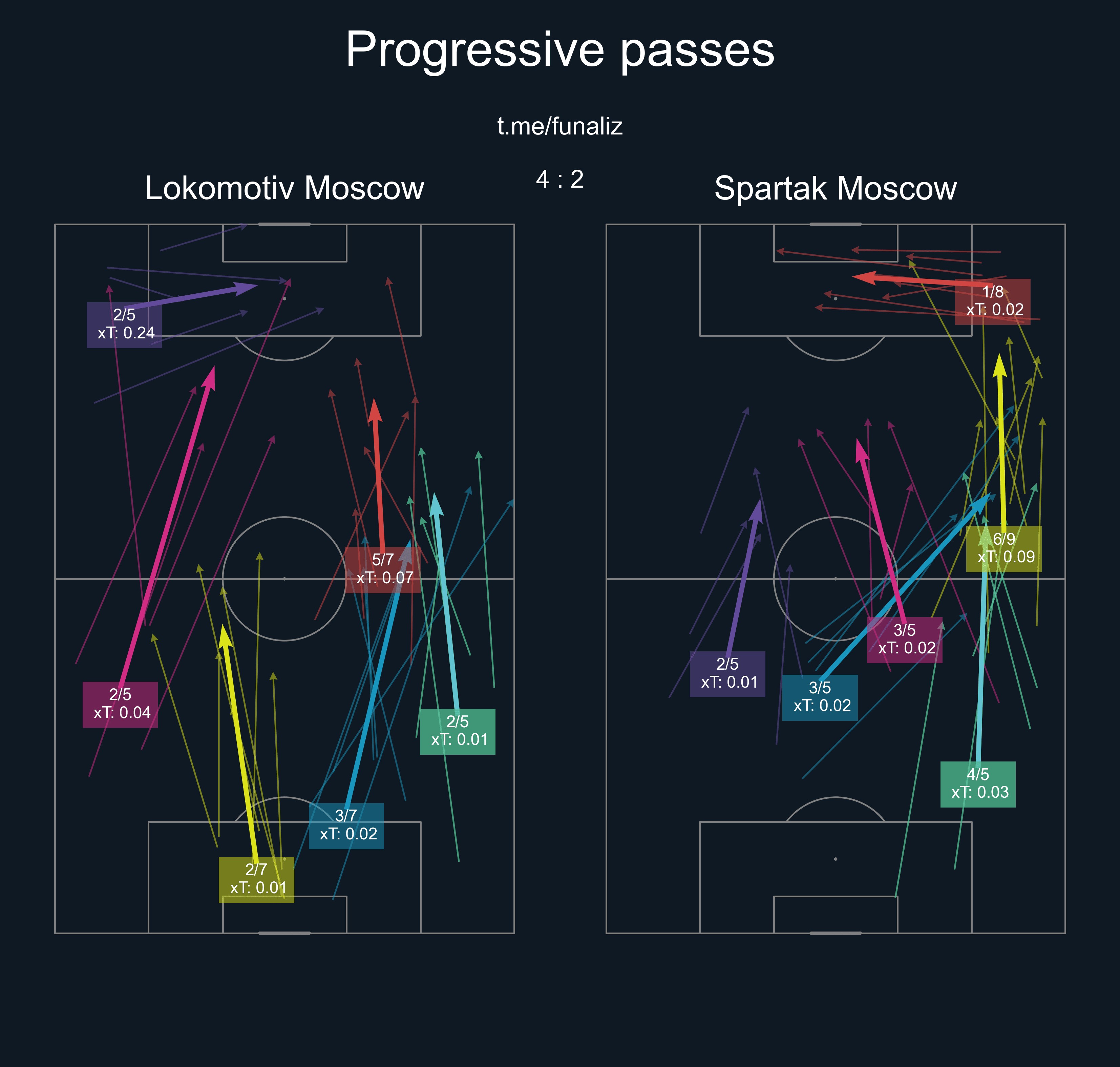 Однако, в отличие от «быков», красно-белые были подвижнее на краях, стараясь формировать тройки в широких зонах. Слева взаимодействовали Маркиньос, Барко и Жедсон, справа — Мартинс, Солари и Гарсия. Голы «Спартака» в ворота «Акрона» и «Локо» показали, что команда Станковича остается одной из лучших в чемпионате в игре на флангах, кроссах на дальнюю штангу — в частности. Это не сюрприз. Но стоит похвалить штаб команды за поправки по сравнению с матчем в Самаре: Мартинс реже действовал перед штрафной как десятка, чаще открывался на пространстве на фланге (Солари освобождал зоны, вытягивая «своего» игрока из линии), а также в створе — и сразу стал едва ли не самым опасным на поле. Он был лучшим по «остроте» принятых передач в матче. И есть еще один примечательный момент: Мартинс до перерыва совершил больше кроссов, чем Маркиньос. Вообще красно-белым лучше удавалось выходить из обороны и обострять игру (до перерыва) именно справа. Это подтверждает и графика с наиболее распространенными передачами с продвижением: