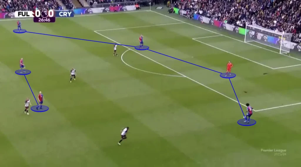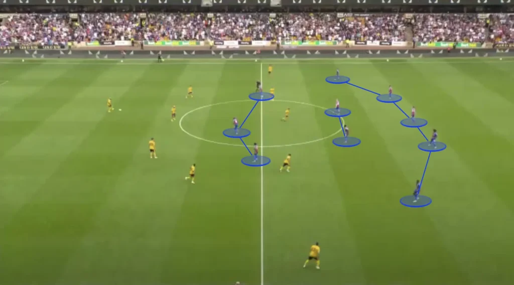 Крайние защитники, как и в системе главного тренера «Манчестер Юнайтед» Рубена Аморима, играют важную роль. Активные крайние защитники увеличивают численное преимущество в атаке и способны активно играть в отборе, достаточно высоко встречая соперника. Это происходит не бездумно. Нападающие «Кристал Пэлас» спускаются ниже, создавая давление на центральных защитников – для того, чтобы противники отдавали на фланги.