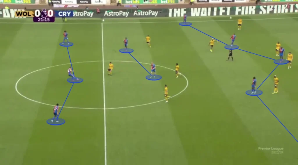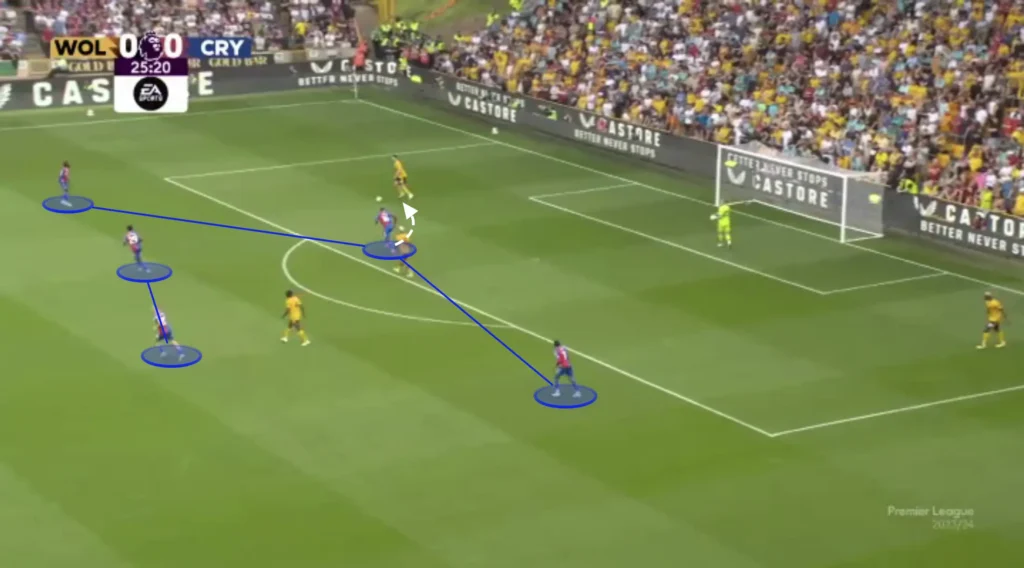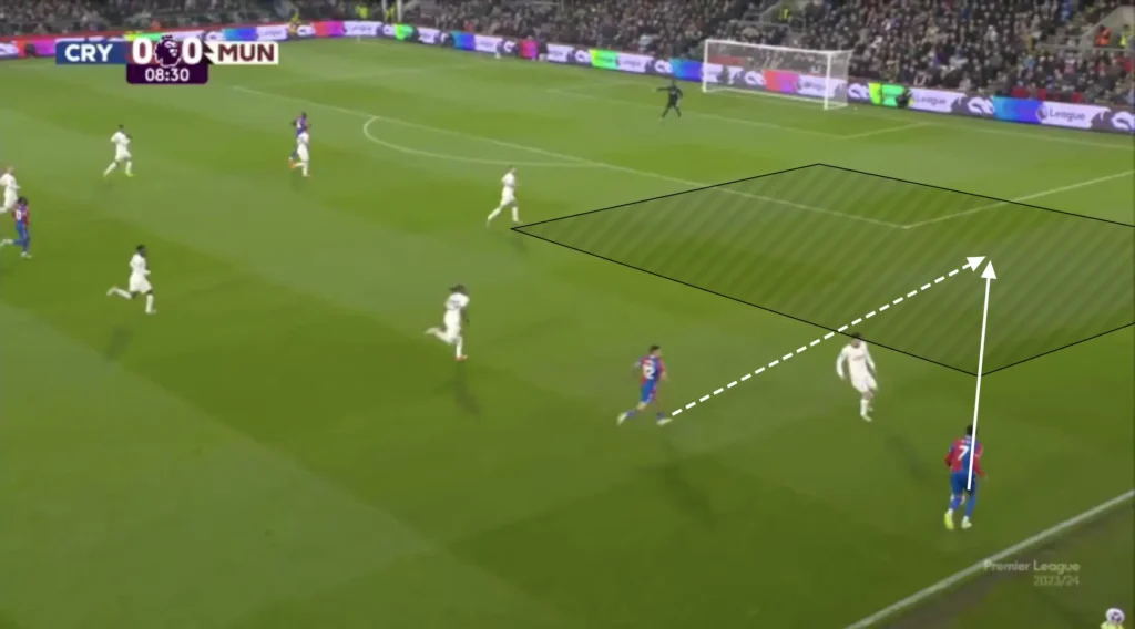 «Кристал Пэлас» круто ведет себя в финальной трети, создавая много моментов в полуфлангах – на перепутье зон центрального защитника и крайнего. Это происходит, если атака начинается на фланге, с ширины передача идет в свободное пространство.
