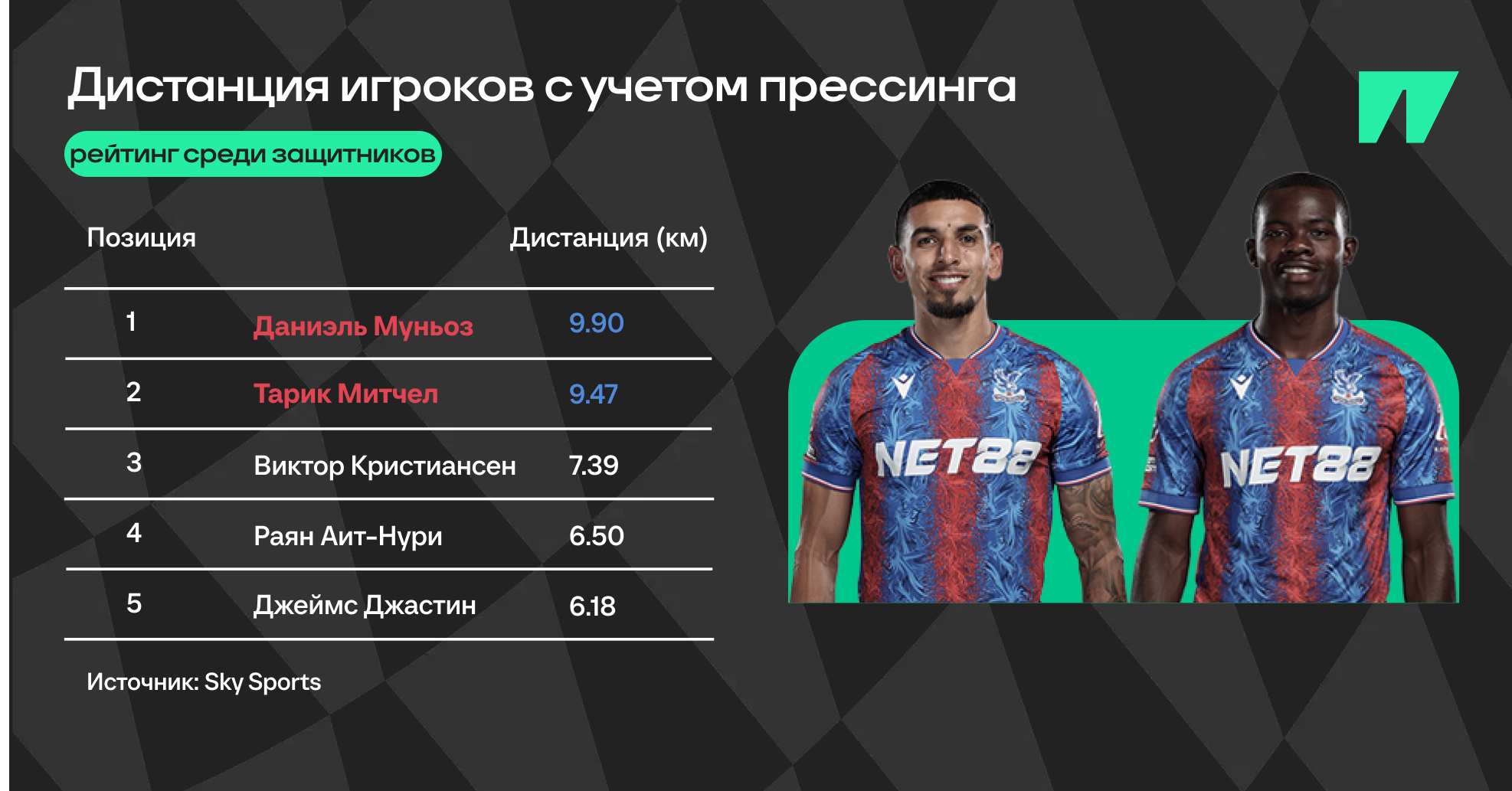 Сарр пробежал больше, чем любой другой игрок «орлов» – 11.4 км в среднем за 90 минут. Сенегальский нападающий был важен и в прессинге команды. Только Бруну Фернандеш из «Манчестер Юнайтед» (447) оказывал больше давления в средней трети поля, чем Сарр (430), а при пересчете на 90 минут Сарр (20.0) уступил лишь Соланке (22.5).