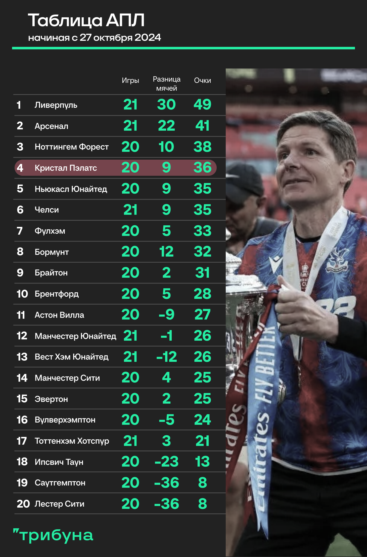 Начало прошлого сезона получилось провальным. К девятому туру против «Тоттенхэма» Постекоглу 27 октября «орлы» барахтались в зоне вылета, имея в своем активе всего 3 очка. «Кристал Пэлас» выиграл ту встречу 1:0 и тут же началось возрождение. С этой победы клуб набирал очки со скоростью клубов уровня «большой шестерки». Если начинать отсчет очков с 27 октября, то «орлы» набрали 36 очков – выше только «Ноттингем Форест» (38), «Арсенал» (41) и чемпион прошлого сезона «Ливерпуль» (49).