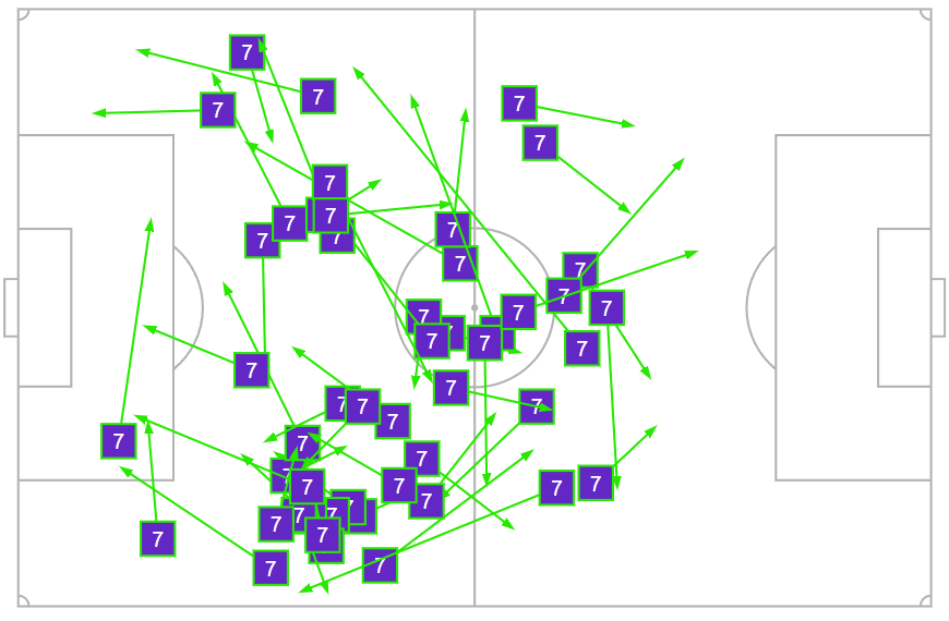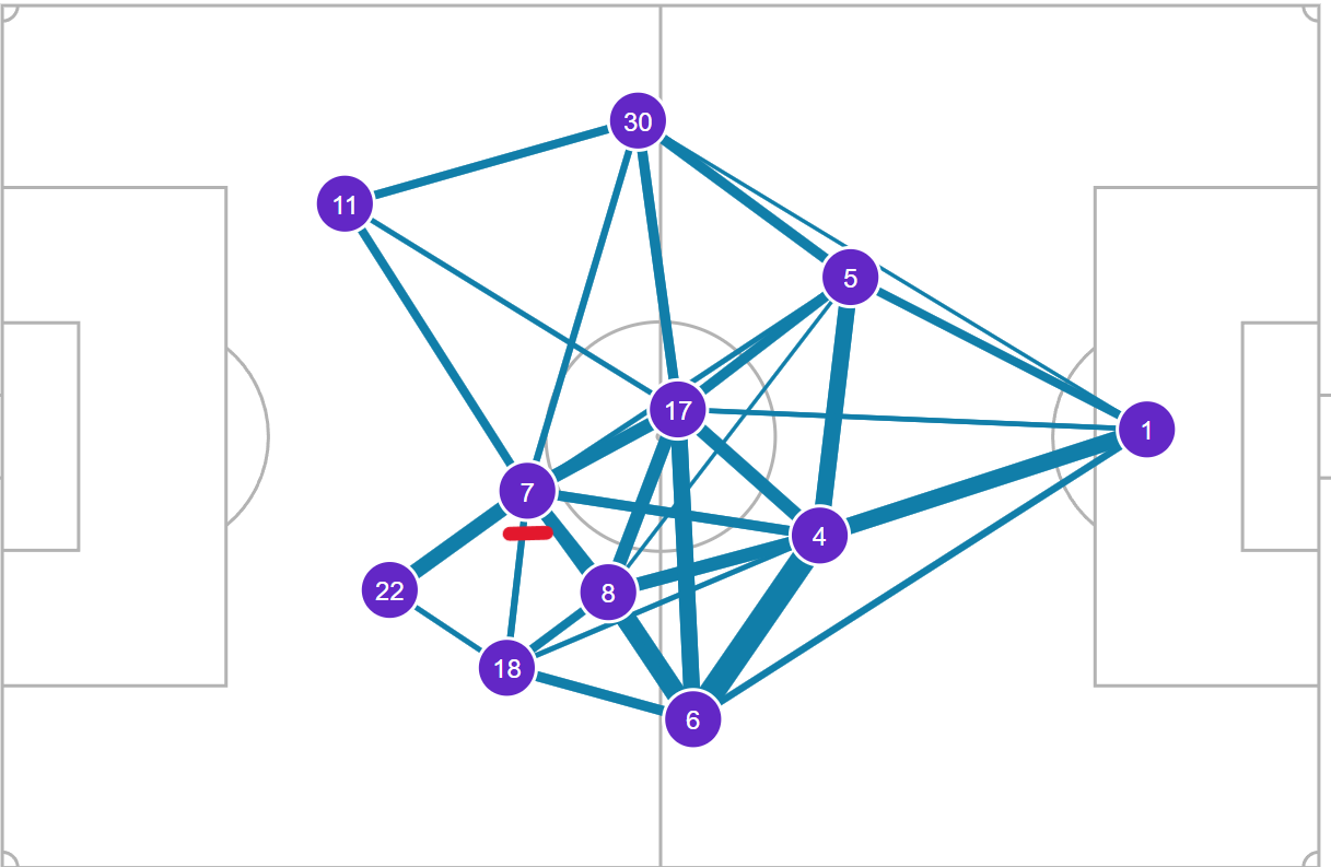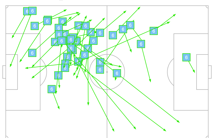 Если опустить взгляд на еще более низкую зону, то обнаружим еще одного новичка, который отлично вписался в командную структуру на мяче — Милош Керкез провел великолепный матч в созидании. Его позиция так же стала неожиданностью, ведь венгр обычно встречался с мячом будучи в тройке центрбеков: