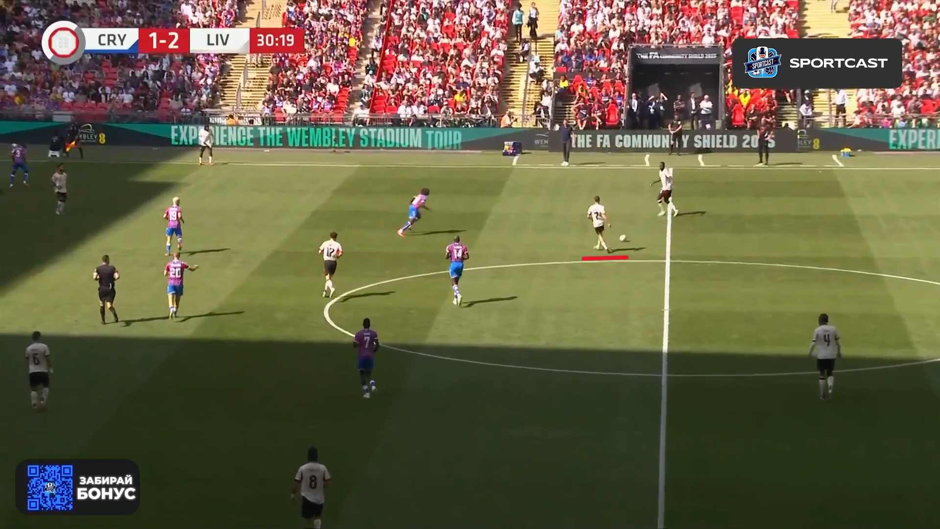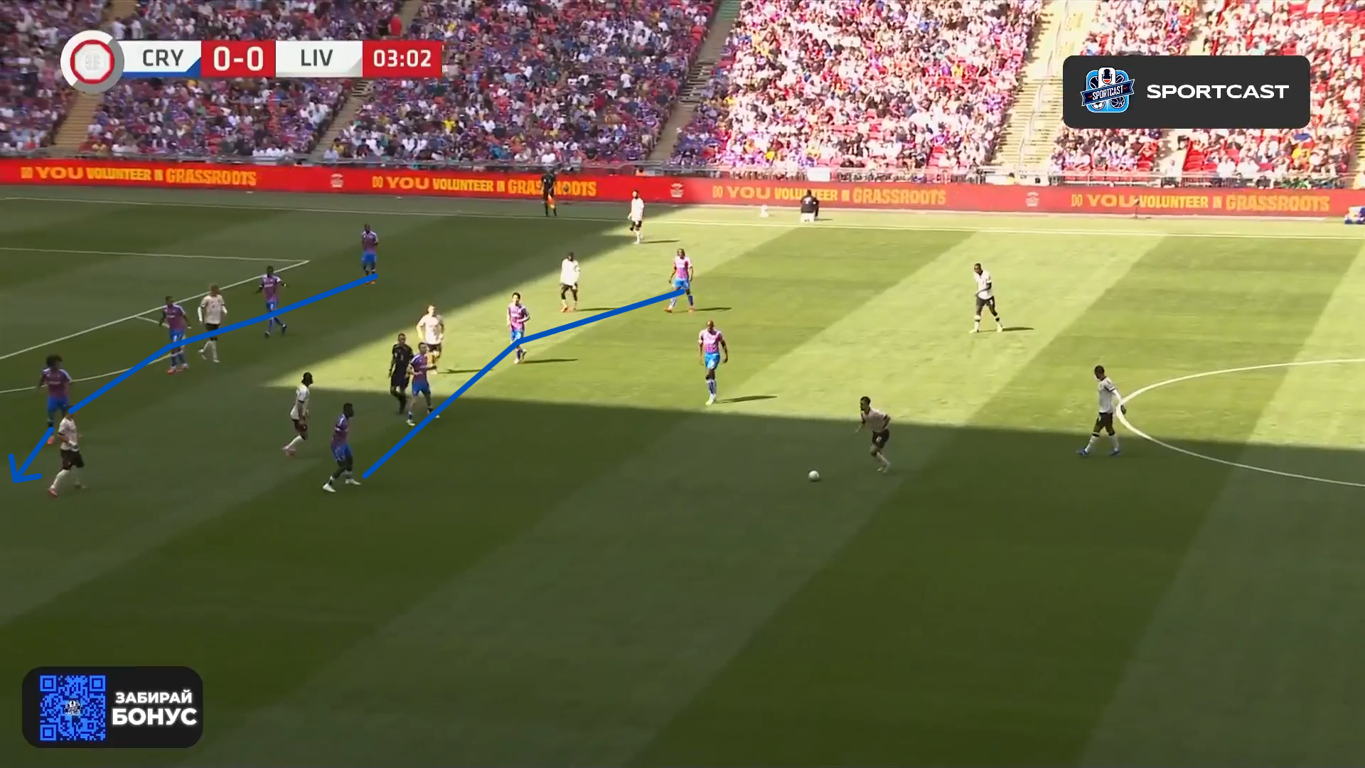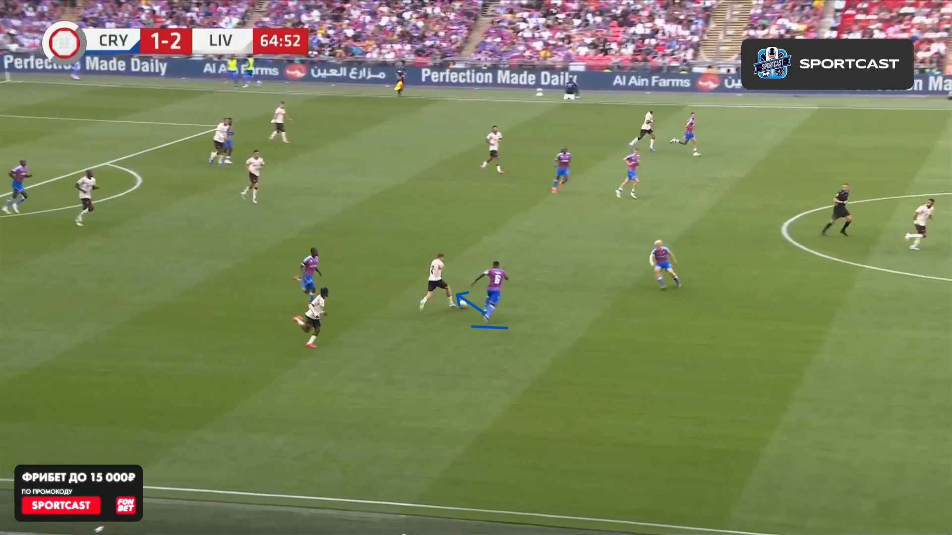 Так «Кристал Пэлас» нащупал свою игру: 35% владения, 53% атак через правый фланг (даже в финале Кубка было меньше — 45%) и лонгболлы. Очень много лонгболлов. 20% от всех передач «орлов» в первом тайме — длинные. Цель ясна — максимально быстро доставить мяч в слабые зоны соперника.