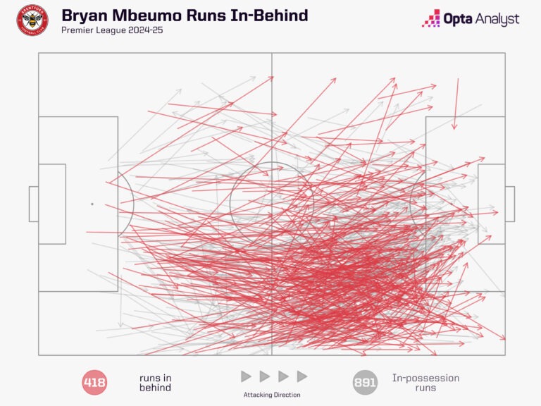 - Брайан Мбемо из «Брентфорда» — универсал, чьи перемещения идеально дополнят склонность Шешко оттягиваться вглубь. В сезоне-2024/25 он лидировал в АПЛ по забегам за спину защитникам (418).