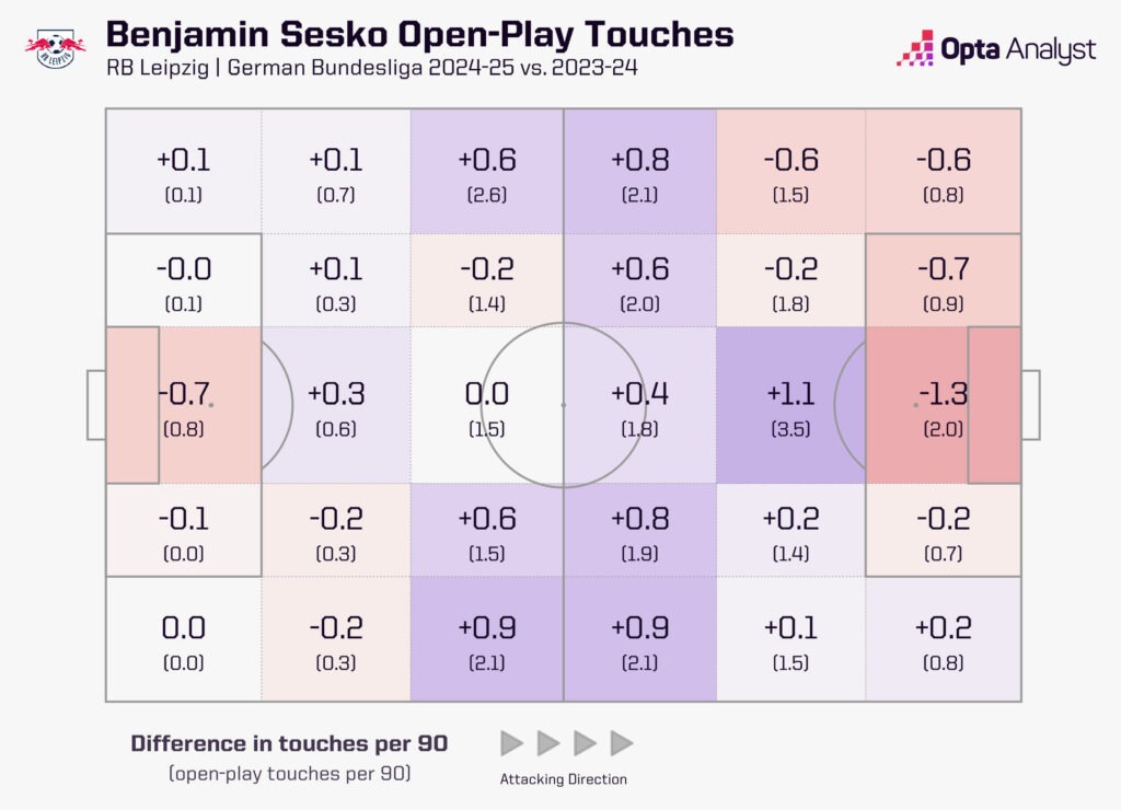 Также Шешко стал реже бить по воротам из штрафной (с 2,4 ударов за 90 минут в предыдущем сезоне до 1,5 в 2024/25) и забил значительно меньше голов с близкой дистанции. Среди 12 игроков, забивших 12+ голов в Бундеслиге в сезоне 2024/25, только вингер «Баварии» Майкл Олисе (66,7%) забил меньший процент голов из штрафной, чем Шешко (76,9%). В этой же группе Шешко демонстрирует самый низкий процент ударов из штрафной площади — всего 63,2%.