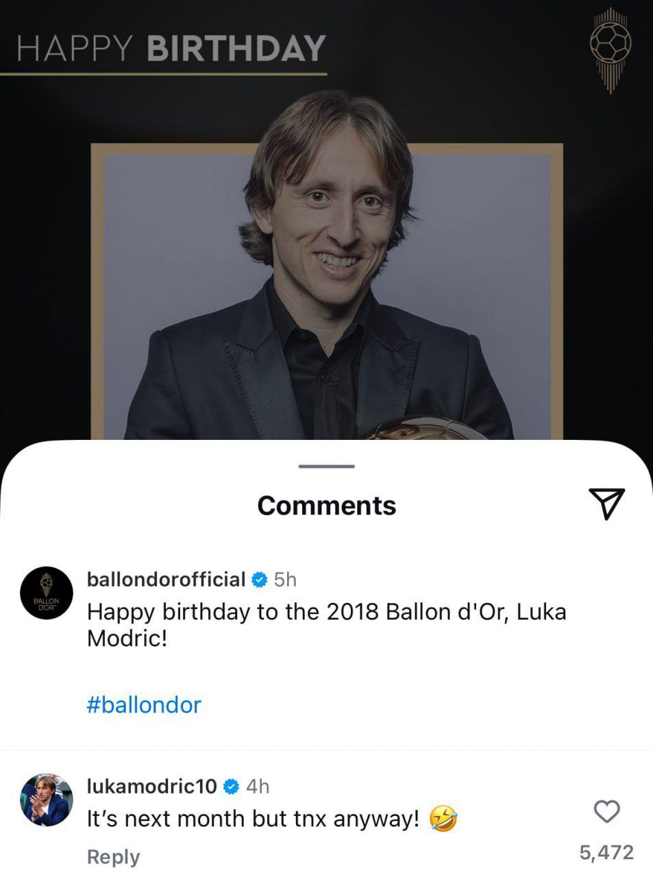 Фальстарт: организаторы «Золотого мяча» поздравили Модрича с днем рождения на месяц раньше — хорват не растерялся 😂